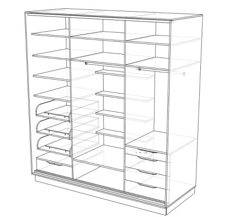 7. Прикрепляем полки, вешалки и ящики. Ящики нужно будет предварительно собрать, а внутри шкафа прикрепить направляющие. Собирая ящики, не забудьте про ручки. Полки можно установить на полкодержатели, если они есть в комплекте, или закрепить конфирматами (тогда полки будут не съёмными). На этом же этапе прикручиваем штанги для плечиков и другие внутренние детали, какие есть в комплекте.