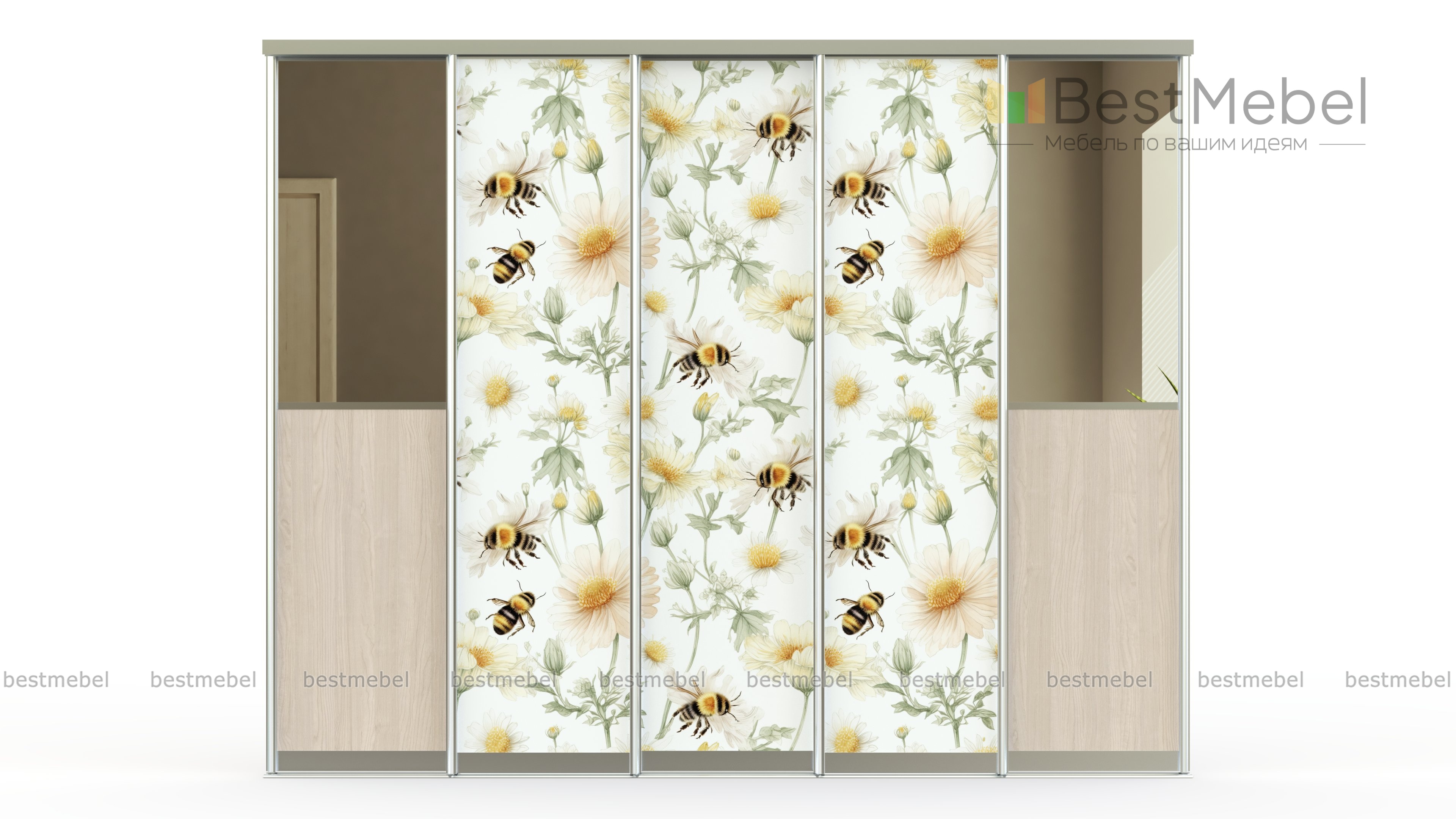 Двери-купе Флайт 2 BMS помогут создать уютный и функциональный интерьер. Для оформления пятидверного фасада использованы высококачественная ламинированная плита древесных тонов и зеркала, а также полотна с изящной фотопечатью. Каркасы дверей изготовлены из алюминиевого профиля с классическим серебристым покрытием - легкого, прочного и не подверженного коррозии. Купить двери-купе Флайт 2 BMS с возможностью выбора цвета и размеров приглашаем к нам в интернет-магазин.