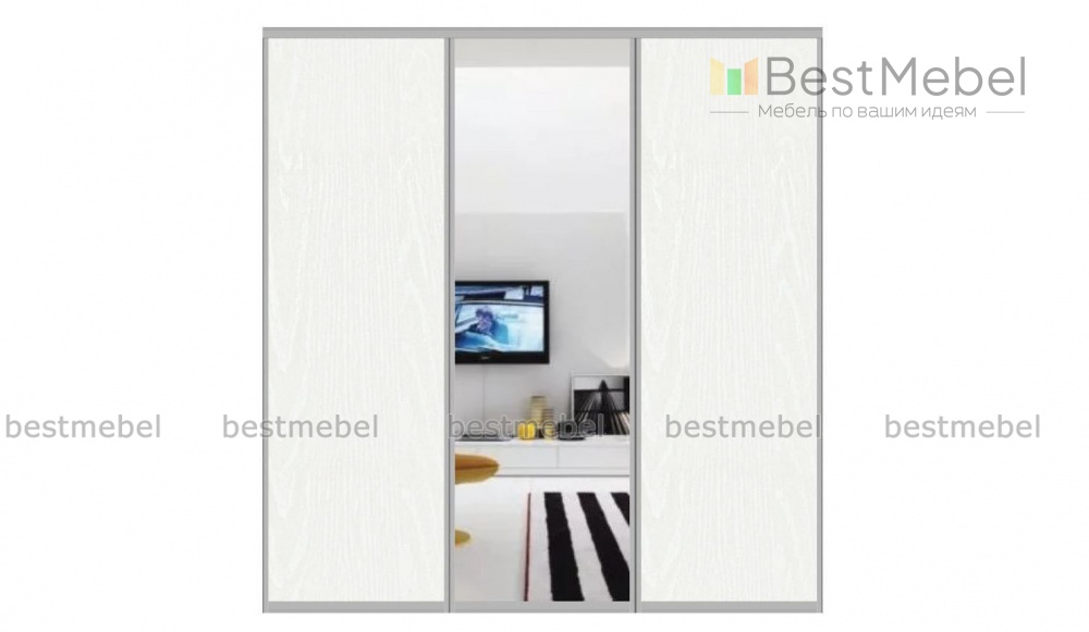 Двери-купе Прайс 2 BMS подчеркнут достоинства современных минималистичных интерьеров. В оформлении фасада скомбинированы две створки в белом цвете с имитацией текстуры дерева и полностью зеркальное полотно в серебристых рамах из профиля. Раздвижные двери для шкафа-купе помогут сохранить полезную площадь комнаты и сделают ее визуально просторнее и светлее. Купить двери-купе Прайс 2 BMS и рационально организовать пространство вам поможет наш интернет-магазин.