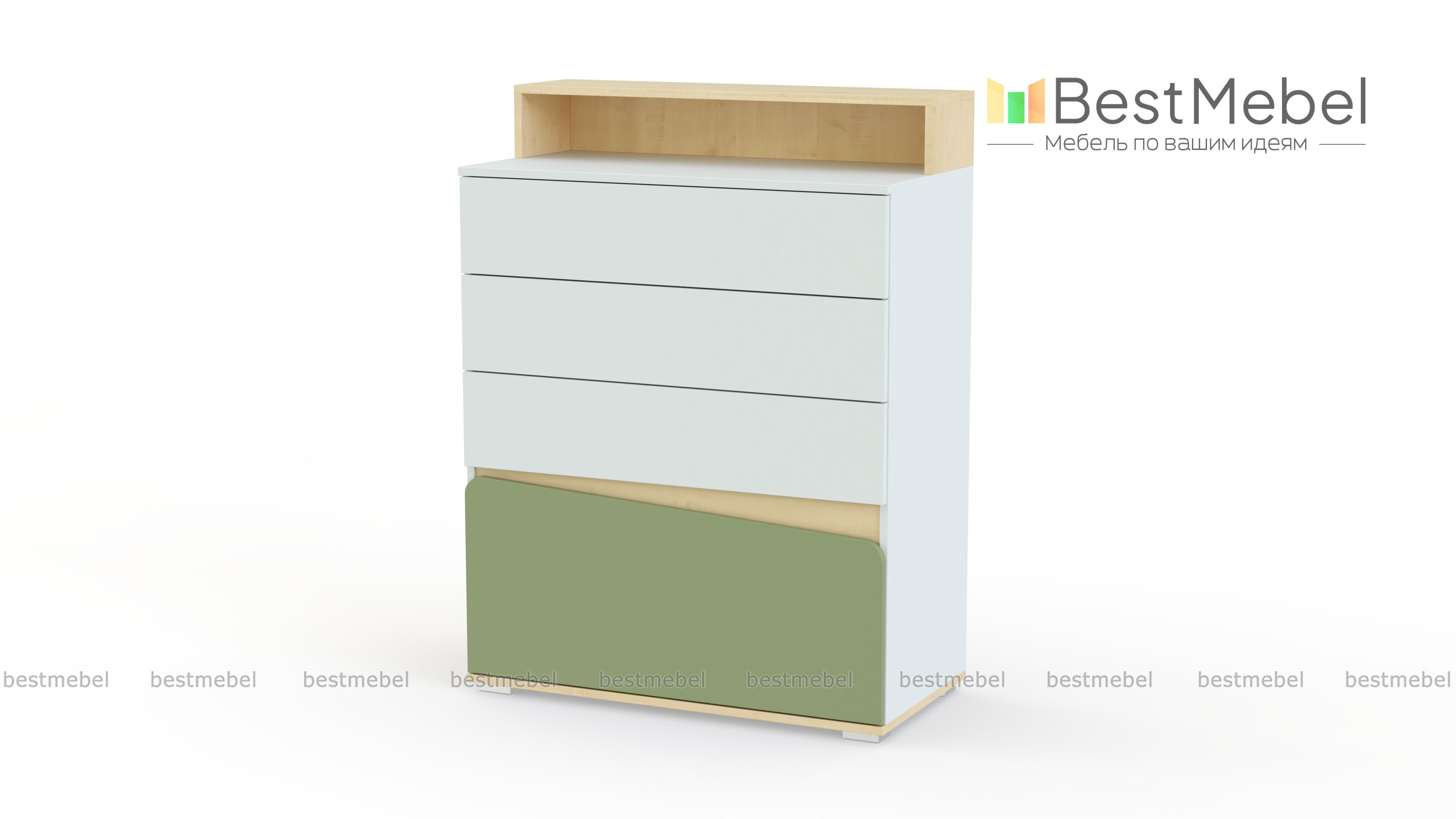 Комод для детской Алиса BMS отличается ярким дизайном и функциональностью. Четыре выдвижных ящика разной высоты и широкая столешница с надстройкой помогут легко поддерживать в комнате порядок и компактно разместить постельное белье, одежду в сложенном виде, аксессуары и множество мелочей. Комод выполнен в белом цвете с контрастными вставками, фасад нижнего ящика асимметрично вырезан и скруглен по краям. Купить комод для детской Алиса BMS и дополнить систему хранения практичным предметом вам поможет наш интернет-магазин.