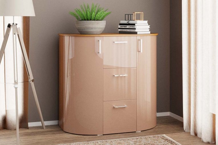 Комод радиусный Этюд 2 BMS с глянцевым выпуклым фасадом станет украшением спальни, гостиной или прихожей. Полукруглая столешница сможет разместить аппаратуру, предметы декора или важные мелочи, а для хранения разнообразных бытовых вещей предусмотрены три выдвижных ящика и боковые распашные отделения с полками. В оформлении комода скомбинированы оттенок капучино и древесные тона. Купить комод радиусный Этюд 2 BMS приглашаем выгодно в наш интернет-магазин.