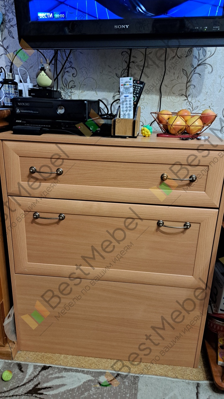Отличный комод: вместительеый, удобный, красивого дизайна. Сборка немного напрягла: муж немного запутался в досках (инструкция непонятная, надо последовательные шаги указать, а не картинку в разрезе. Но самое загадочное - отсутствие дыр для ручек на откидной крышке. Пришлось высверливать для болтов. Затратно по времени вышло.