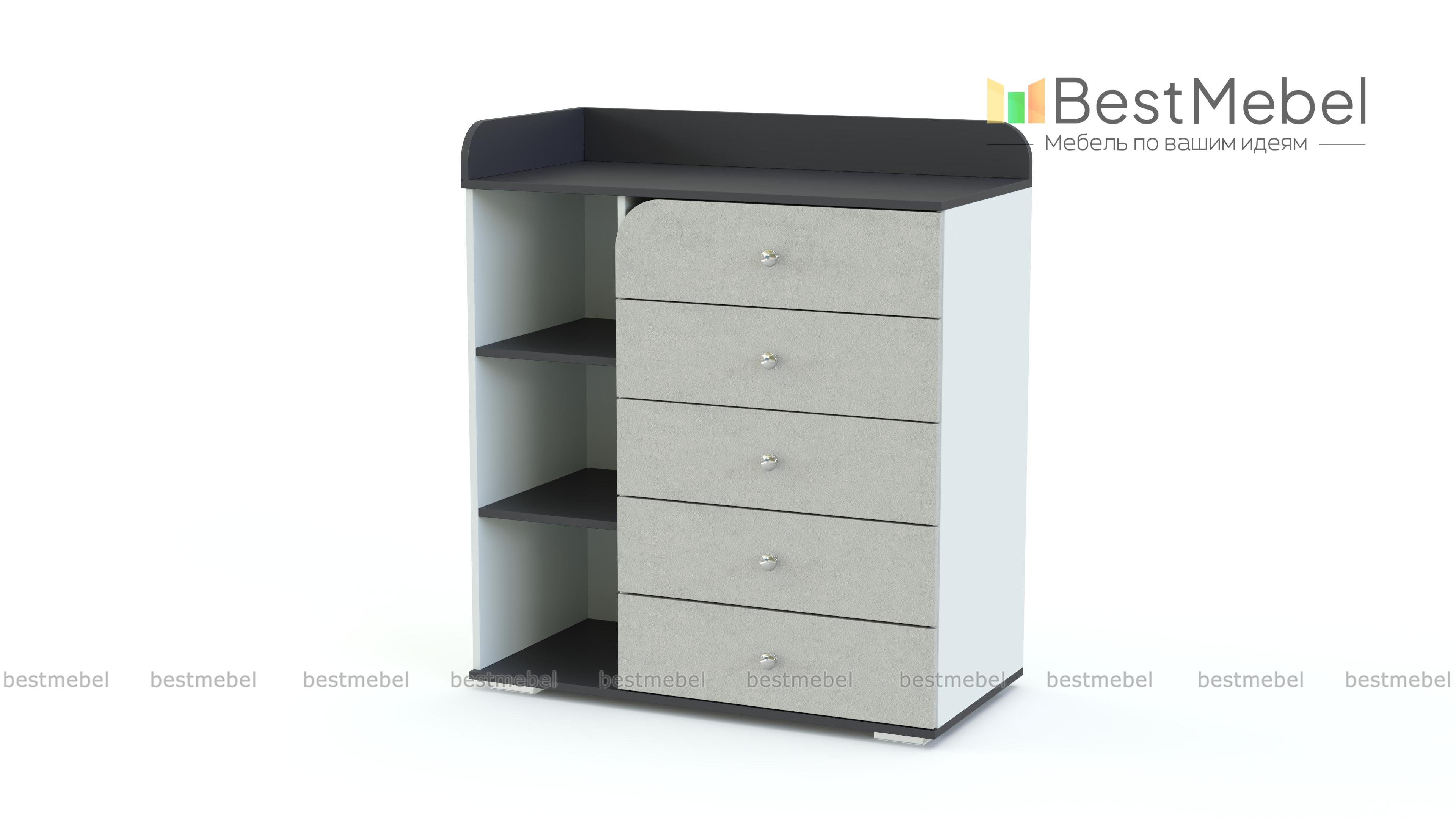 Пеленальный комод Арка 2 BMS с расположенными углом защитными бортиками позволит укладывать малыша вдоль задней стенки и боком к маме. Пять выдвижных ящиков, один из которых с полукруглым вырезом, и три открытые секции разместят все необходимые под рукой средства гигиены, пеленки, одежду и игрушки. Оригинальный дизайн в сочетании с широким выбором цветовых решений позволяет гармонично вписать комод в любую детскую. Купить пеленальный комод Арка 2 BMS по доступной цене приглашаем в наш интернет-магазин.