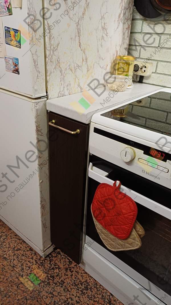Заказывала в дополнение к кухне София, нужно было добавить узкий нестандартный шкафчик в небольшой промежуток. Получилось просто идеально, бутылочница встала как «доктор прописал».