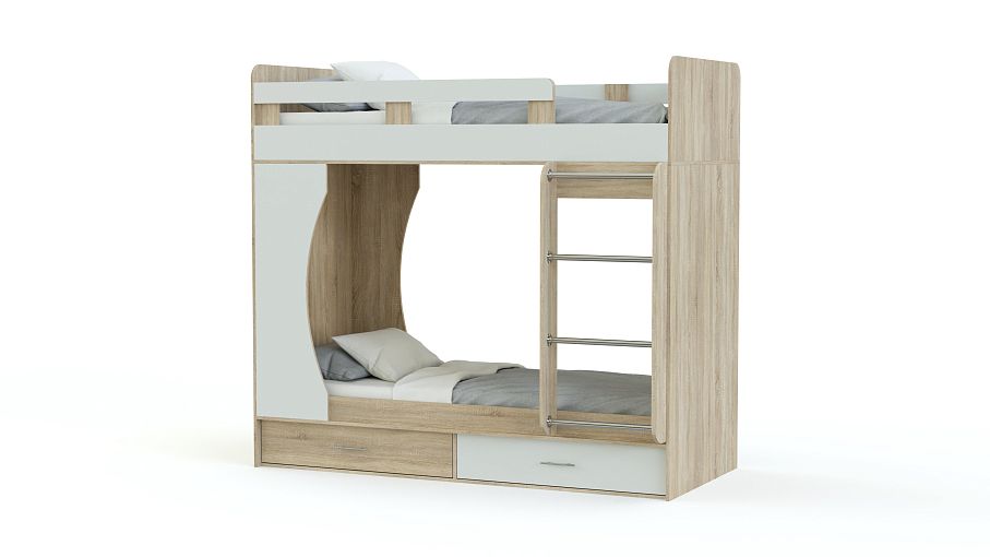 Детская двухъярусная кровать ДМ 112 BMS привлекательно выглядит благодаря современному дизайну. Практичность изделия составляет ее продуманная конструкция, создающая комфортную спальню двоим владельцам. «Этажи» соединены лестницей с металлическими ступенями. Верхняя постель оснащена бортиками для защиты спящего или играющего ребенка, есть изголовье, изножье. Под основанием нижней расположились выдвижные ящики большой вместимости с удобными ручками. Материал – ЛДСП, кромка ПВХ. Расцветка разнообразная: яркие и сдержанные варианты, гармонично смотрится комбинация оттенков.