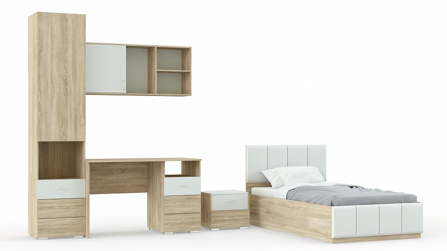 Детская комната Белла 1 BMS выполнена в популярном сочетании светлого древесного оттенка и белого. Модульная коллекция объединила кровать с мягкой обивкой изголовья в экокоже, прикроватную тумбу, однотумбовый письменный стол, дополненный навесной книжной полкой, и комбинированный пенал. Надежность конструкции и износостойкие материалы станут залогом долговечности и эстетичного вида. Купить детскую комнату Белла 1 BMS вы сможете в нашем интернет-магазине по доступной цене.