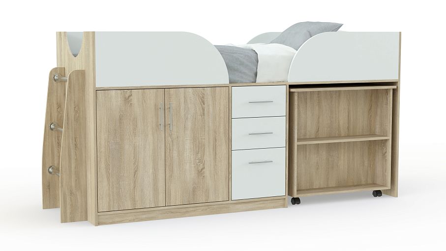 Детская кровать-чердак Дет41 BMS – оптимальное приобретение, если нужно получить практичную модель. Она сэкономит место в маленькой спальне. Постель расположена наверху, оснащена бортами. Попасть в нее можно по лестнице с хромированными ступенями-трубами. Нижняя часть представляет систему хранения: шкаф с двумя дверцами (внутри полка), комод с 3-мя ящиками выдвижного типа. Учиться или заниматься творчеством ребенок сможет за столом, лицевая часть оснащена полками. Отличная возможность аккуратно расставить книги, учебники! Элемент выдвигается из-под основания кровати. Цветовая гамма ЛДСП представлена в вариантах, подходящих для мальчика или девочки.
