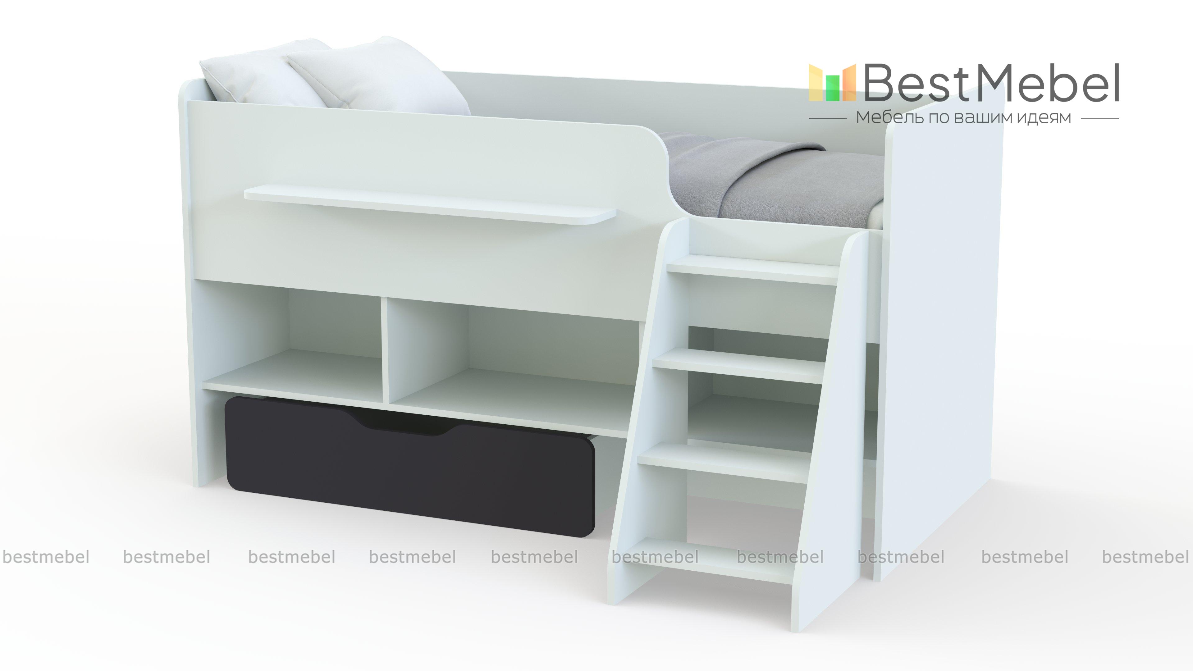 Детская кровать-чердак Миф 6 BMS станет практичным решением для небольших комнат. Комбинированная модель поможет сэкономить полезную площадь для игр, объединив просторное, ровное спальное место и продуманную систему хранения. Уютная кровать, выполненная в универсальном белом цвете, оборудована защитными скругленными бортиками и устойчивой лестницей. В основании же располагаются открытые полки для книг и игрушек и вместительный выкатной короб для постельного белья. Купить детскую кровать-чердак Миф 6 BMS вы сможете в нашем интернет-магазине.