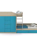 Двухъярусная кровать Море 14 BMS – замечательный вариант для организации зоны отдыха для двоих детей. Интересно решено размещение постелей, соединенных лестницей с хромированными ступенями. Они расположены не строго друг под другом, что создает больше возможностей для игр, общения. Под основанием верхнего спального места предусмотрена вместительная система хранения для гардероба владельцев. Три отделения: платяное со штангой, бельевое с полками, в центре – 4 ящика на направляющих. Нижняя кроватка оборудована выкатными элементами, где удобно разложить игрушки, постельный текстиль.