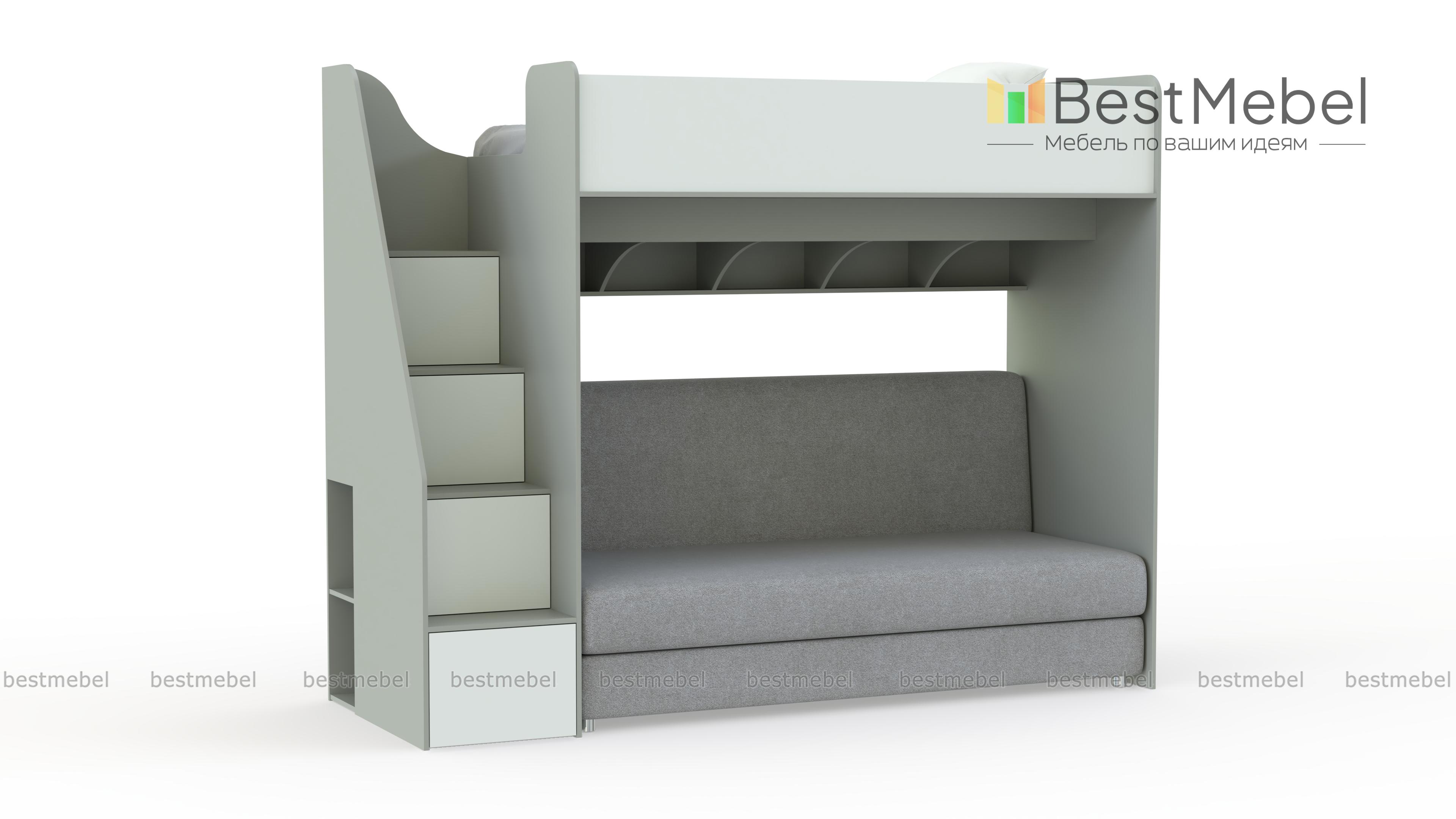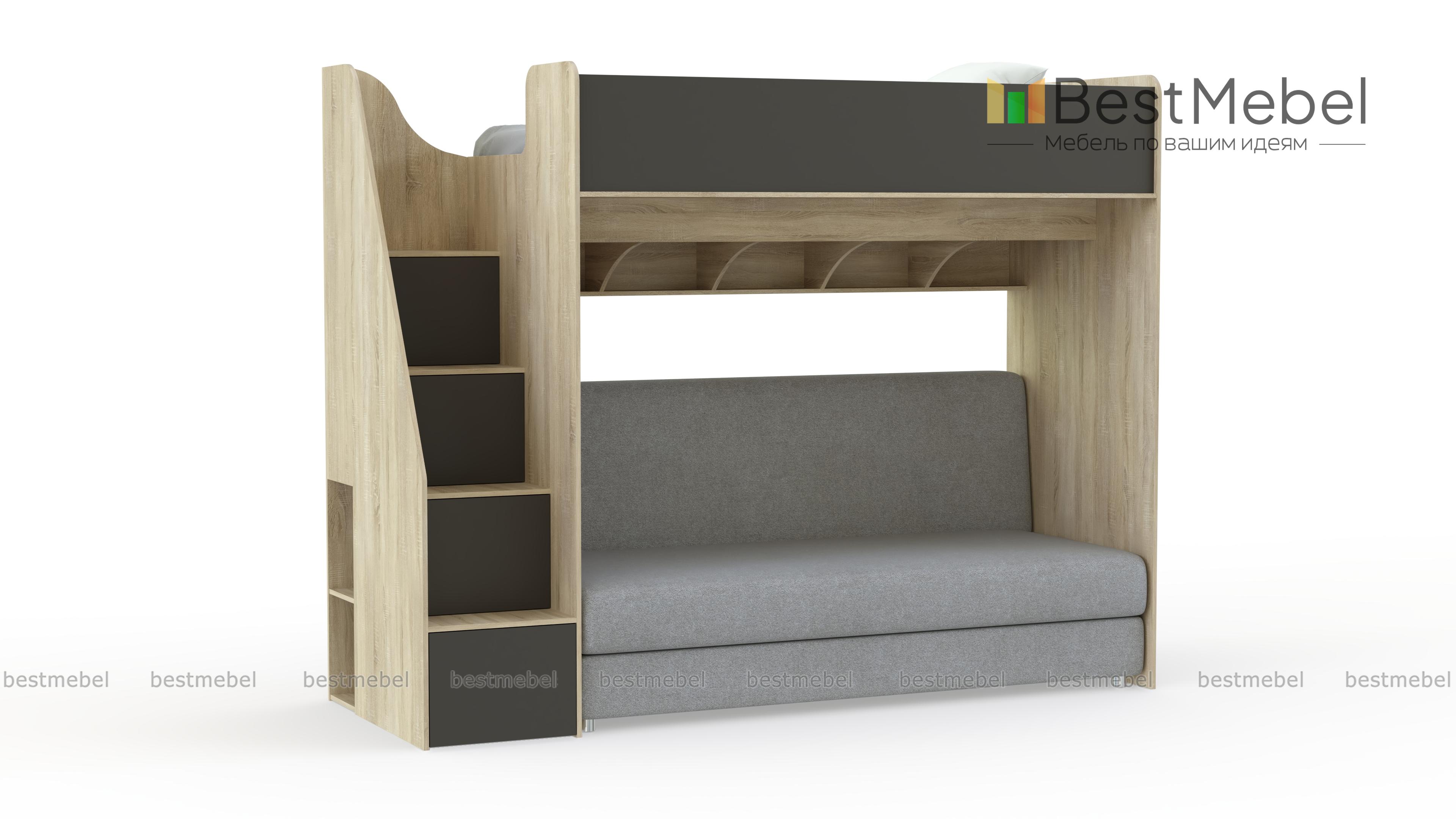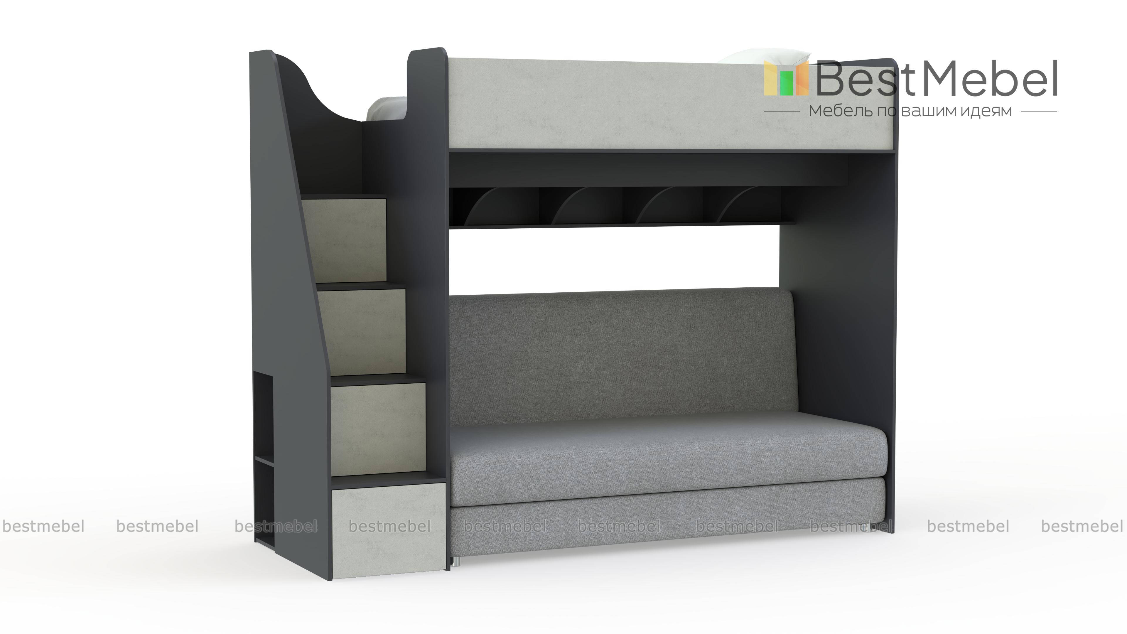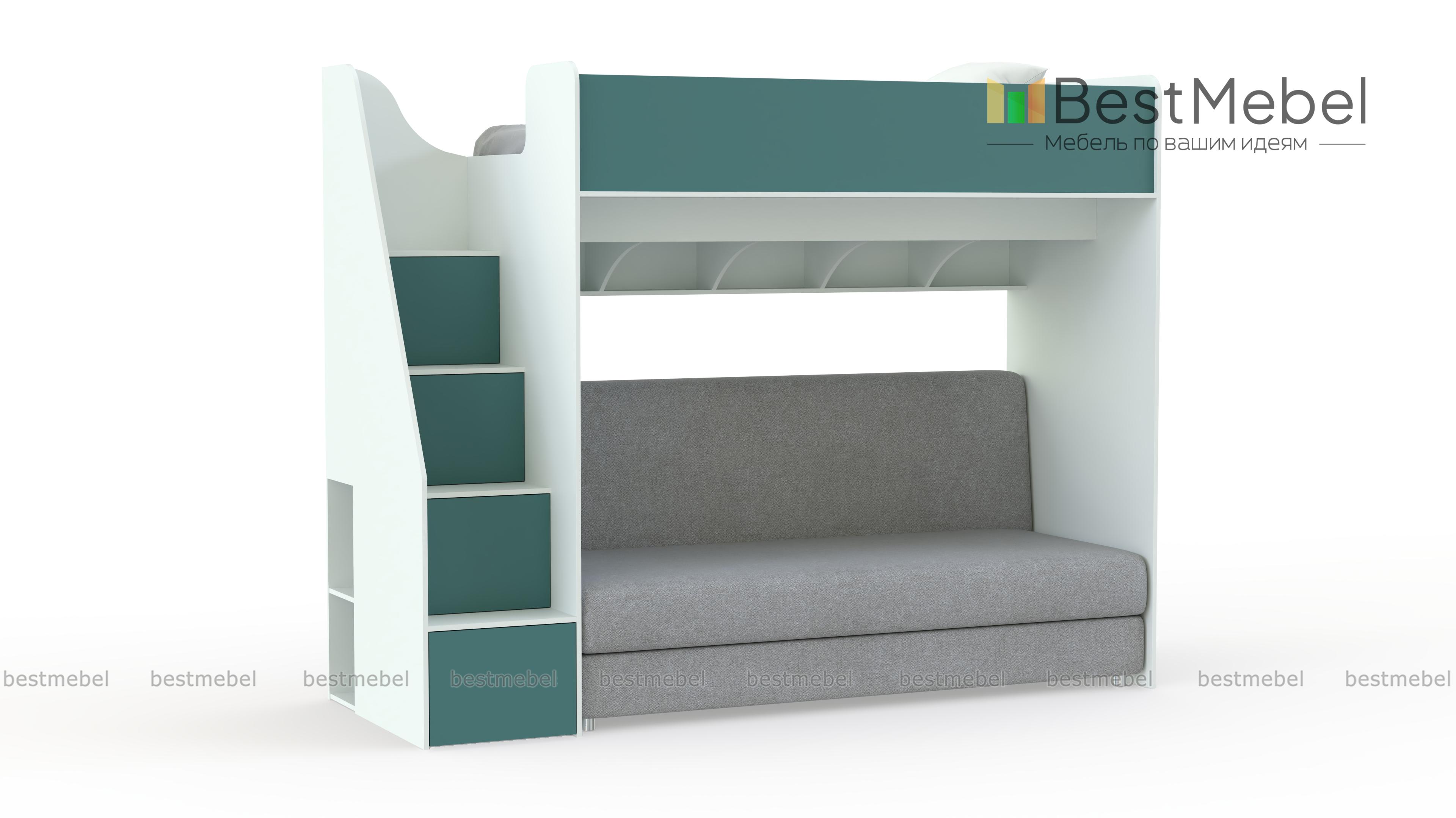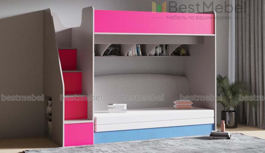 Кровать с диваном Пример 18 BMS с фасадами в ярком терракотовом оттенке гармонично дополнит интерьер современной девичьей спальни. Верхний ярус оборудован просторным спальным местом с бортиком, а на нижнем располагаются книжные полки с перегородками и раскладной диван. Практичным дополнением композиции станет лестница-комод с вместительными отделениями для книг и игрушек. Купить кровать с диваном Пример 18 BMS и выгодно задействовать пространство вам поможет наш интернет-магазин.