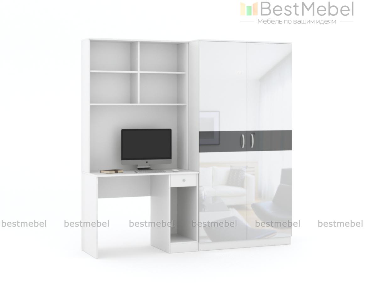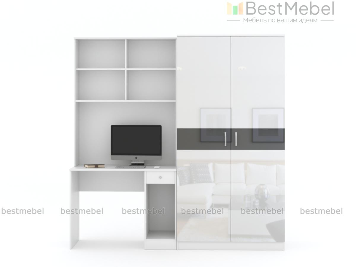 Шкаф со столом Октава 7 BMS поможет вам сэкономить на лишней мебели и создать комфортный современный интерьер. Композиция объединила двухдверный платяной шкаф и компьютерный стол, оборудованный нишей под системный блок, ящиком для мелочей и надстройкой с книжными полками. Корпус белого цвета скомбинирован с глянцевым фасадом, декорированным контрастной черной вставкой. Купить шкаф со столом Октава 7 BMS по доступной цене приглашаем к нам в интернет-магазин.