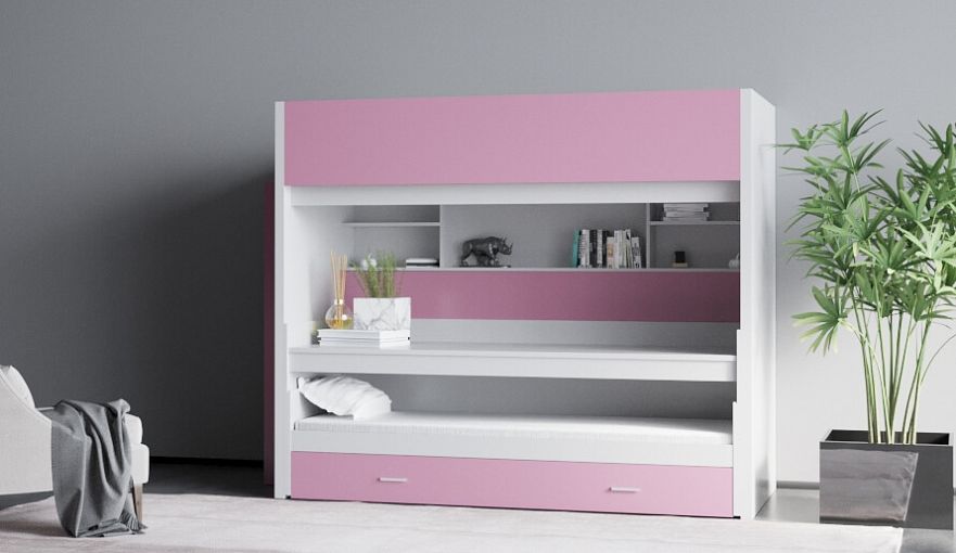 Трёхъярусная кровать Рона 2 BMS обеспечит экономию полезной площади и гармонично впишется в современный детский интерьер. Многофункциональная модель представляет собой кровать-чердак, в нише которой располагаются книжные полки и выкатные элементы – рабочий стол и два спальных места. Спальное место верхнего яруса дополнено защитным бортиком и лестницей. Несколько вариантов трансформации модели позволят максимально эффективно использовать пространство. Купить трёхъярусную кровать Рона 2 BMS вы сможете в нашем интернет-магазине.