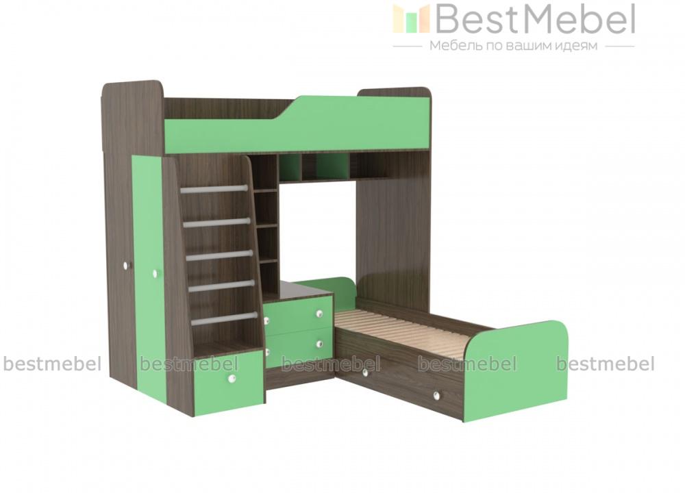 Угловая двухъярусная кровать Астра-4 BMS это современный мебельный комплекс, оборудованный всем необходимым для комфортного сна и хранения вещей двух детей. Выполненная в сочетании поверхностей древесного оттенка и белых вставок, кровать гармонично впишется в интерьер детских и молодежных комнат. В комплект входят расположенные на разных ярусах кровати, открытые полки, тумба, лестница с ящиком в основании и распашной шкаф для одежды. Скругленные углы делают пользование безопасным. Купить угловую двухъярусную кровать Астра-4 BMS приглашаем в наш интернет-магазин.