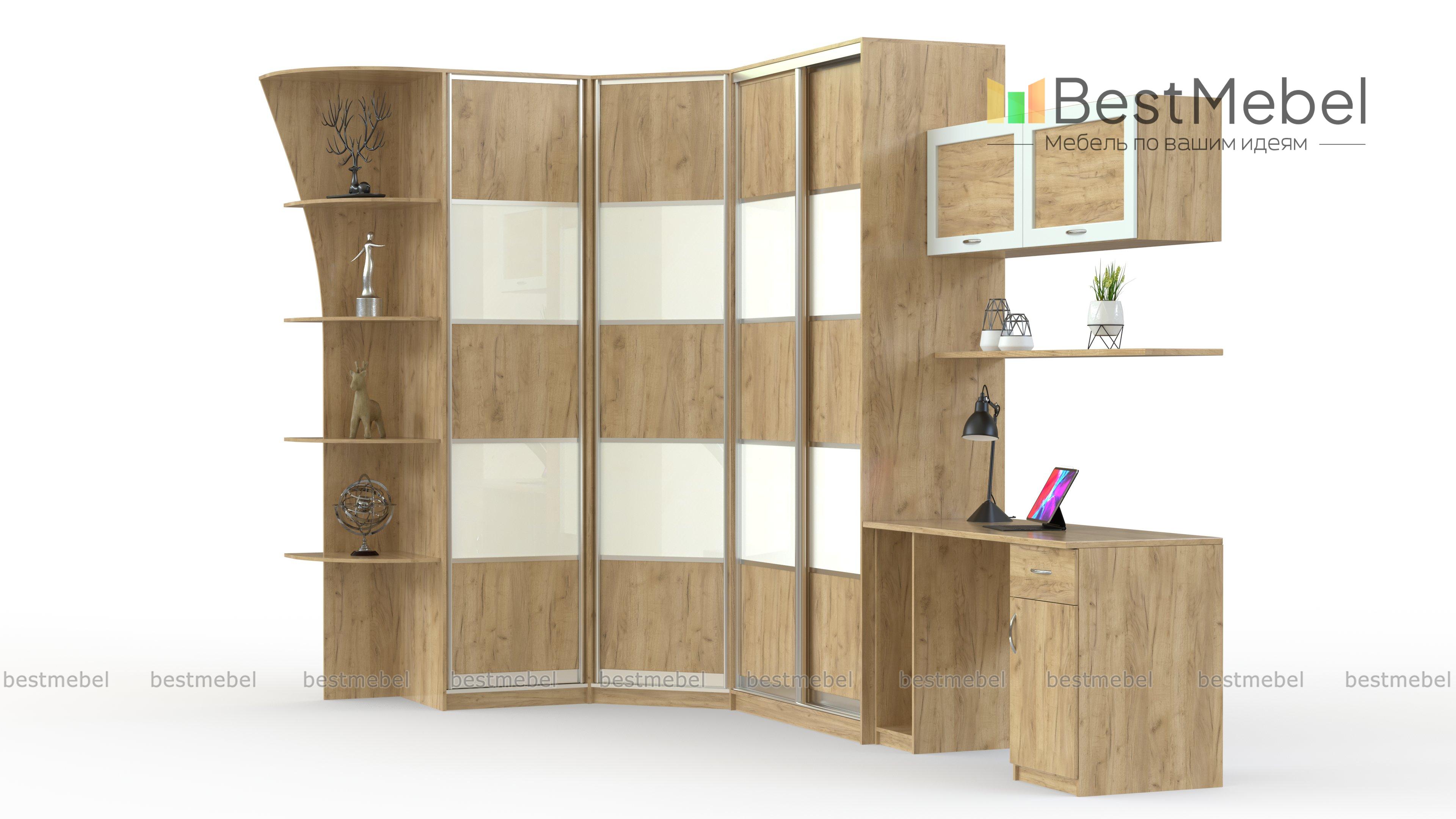 Угловой гардероб со столом Алиса 01 BMS поможет без труда поддерживать порядок и оборудовать комфортное рабочее место даже в небольшой комнате. Стильная композиция, выполненная в сочетании теплых древесных тонов и белого, состоит из угловой шкафной группы, элегантного торцевого стеллажа, компьютерного стола с тумбой и нишей под системный блок и навесных полок для книг и канцелярских принадлежностей. Купить угловой гардероб со столом Алиса 01 BMS для молодежной комнаты приглашаем в наш интернет-магазин.