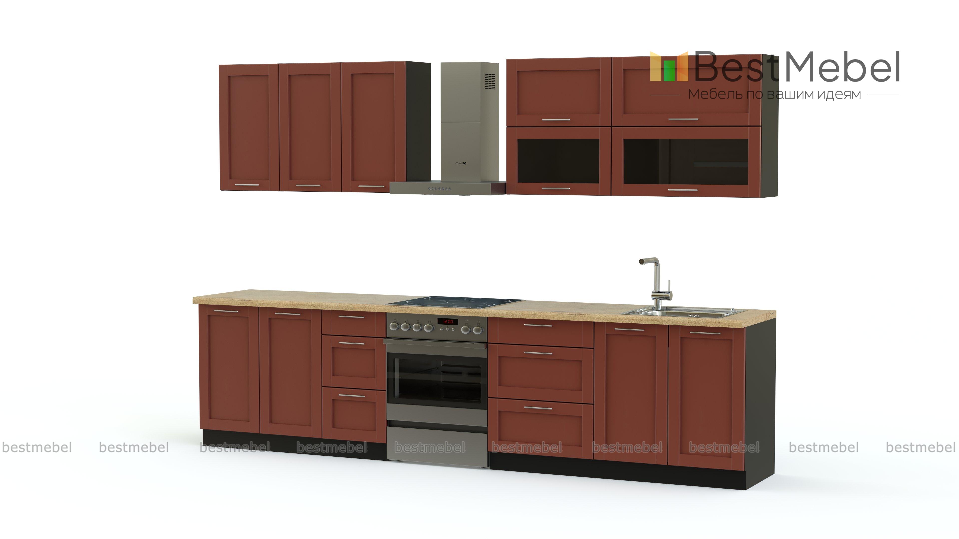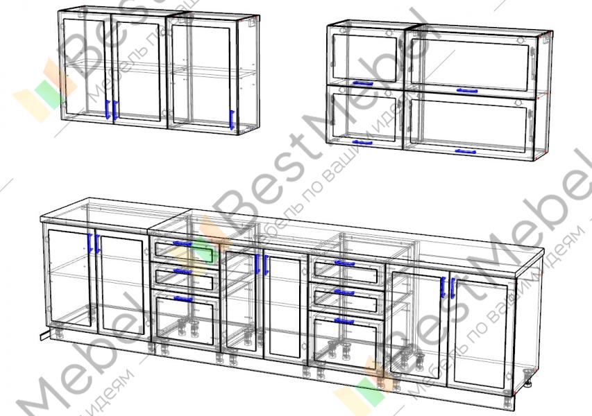 В комплект для современной кухни Экран 2 BMS входит по четыре вместительных модуля в нижней и верхней части. Шкафчики имеют выдвижные, распашные и открывающиеся вверх ящики, отвечающие самым разнообразным нуждам. Выполненные в модном темном оттенке, фасады украшены рамочной фрезеровкой. Они не только практичны и долговечны, но и эффектно смотрятся. Дополняют оригинальный дизайн крупная фурнитура, прозрачные стеклянные дверцы посудных шкафов и устойчивые алюминиевые ножки.
