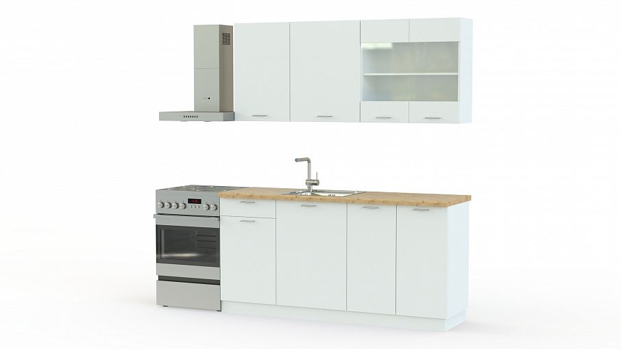 Недорогая, компактная и симпатичная кухня Элен белый BMS придется по вкусу владельцам небольших помещений. Модель прямостоящая, состоит из трех нижних и трех навесных модулей. Внизу расположены тумба под мойку, двойная с полками, и одинарная тумбочка с полочками и выдвижным ящичком. Сверху: двойной посудный шкаф со стеклянными матовыми дверками и два шкафчика для хранения продуктов. У нас Вы можете купить кухню Элен Белый BMS по выгодной цене, выполненный в любом цвете и нужных Вам размеров.