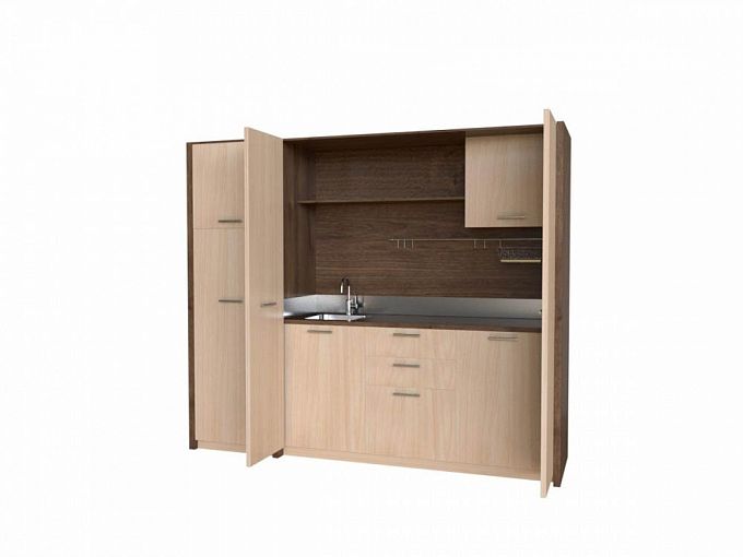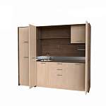Мини-кухня модель 59 BMS позволит оборудовать полноценную обеденную зону для сотрудников и максимально органично впишется в офисный интерьер. Современная конструкция в закрытом виде представляет собой стандартный шкаф с глухими фасадами. В левой части с антресолью вы сможете разместить встроенный холодильник, а за складными створками правой скрыты тумбы под мойку, плиту, выдвижные ящики и открытые отделения. Расцветка в бежевых древесных тонах универсальна для меблировки разного типа. Купить Мини-кухню модель 59 BMS с учетом необходимых параметров приглашаем в наш интернет-магазин.