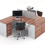 Бенч-система Лора 45 BMS поможет оборудовать комфортные рабочие места как в классическом рабочем кабинете, так и в просторных офисах открытого типа. Практичная модель объединила два угловых компьютерных стола с эргономично вырезанным передним краем, тумбы с выдвижными ящиками для канцелярии и личных вещей и вместительные мобильные тумбы с колесиками. Разделяет сотрудников настольная перегородка. Купить бенч-систему Лора 45 BMS с фасадами под массив дерева приглашаем в наш интернет-магазин.