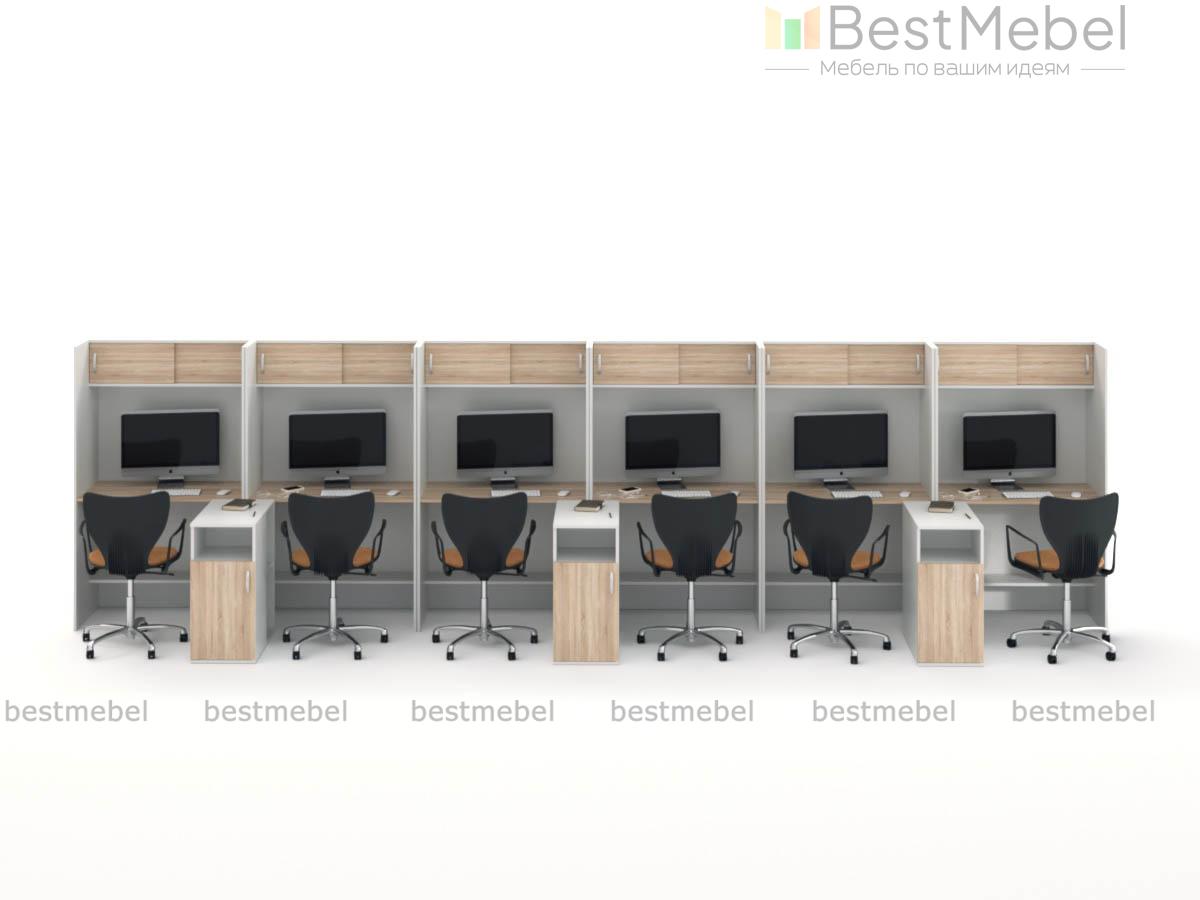 Бенч-система Тим 8 BMS станет практичным решением для меблировки просторных офисов открытого типа. Эффективно использовать возможности планировки поможет композиция, объединившая шесть рабочих мест. Каждая из секций, разделенных между собой перегородками, оборудована прямоугольной столешницей с нижней полкой под системный блок и надстройкой с раздвижным отделением для документов. Удобное размещение рабочих материалов обеспечат три распашные тумбы с нишами. Купить бенч-систему Тим 8 BMS приглашаем в наш интернет-магазин по выгодной цене.