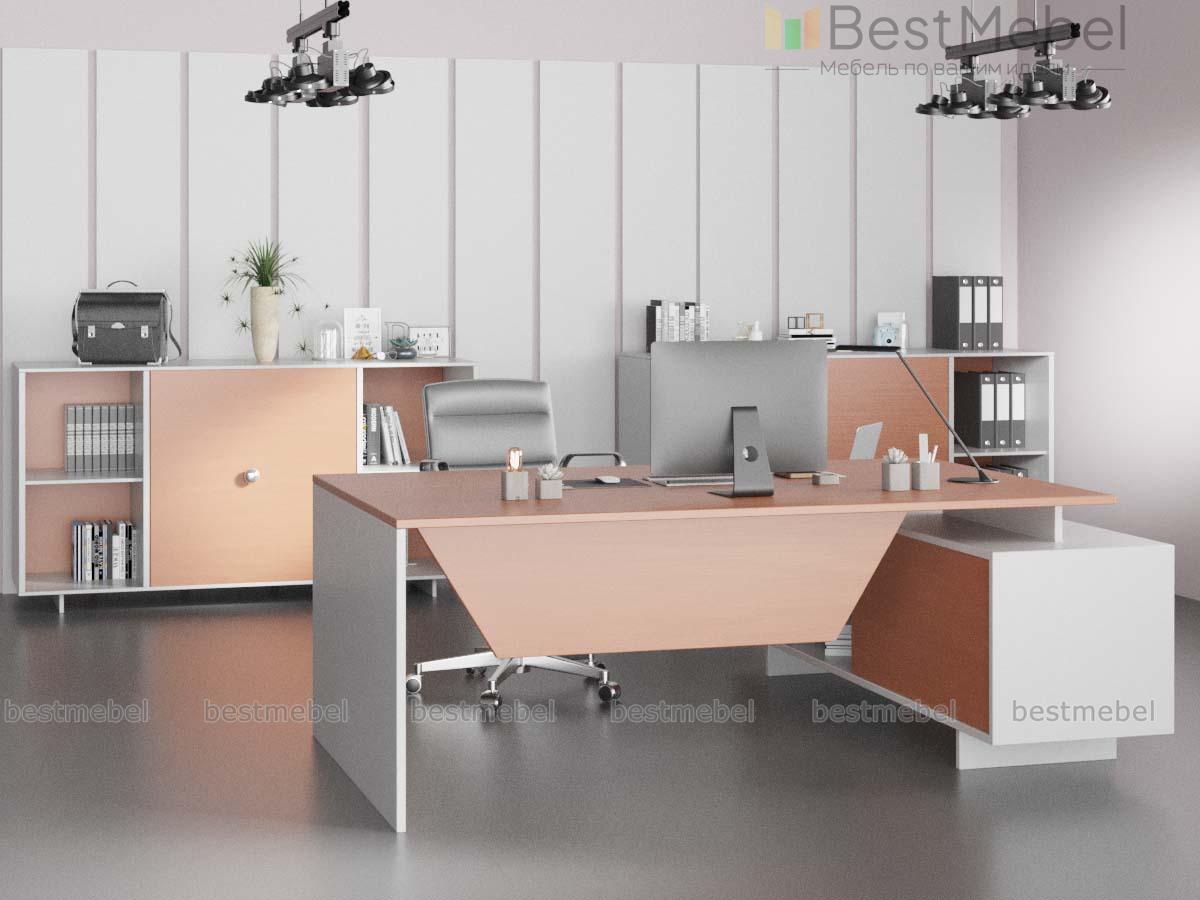 Кабинет руководителя Марио 1 BMS поможет создать визуально легкий, современный интерьер. Комплект включает в себя рабочий стол с широкой опорной тумбой и экраном, а также два низких шкафа-купе для хранения документов. Выполненные в сочетании универсального белого и теплых древесных тонов, предметы будут гармонично смотреться как в просторных, так и в небольших помещениях. Купить кабинет руководителя Марио 1 BMS приглашаем в наш интернет-магазин по выгодной цене.