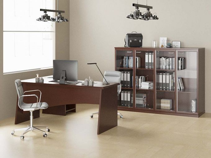 Кабинет руководителя Престон 7 BMS – это элегантная современная классика, которая подчеркнет высокий статус владельца. Модульный комплект включает в себя рабочий стол с тумбой, оборудованной выдвижными ящиками для хранения канцелярских принадлежностей и личных вещей, и шкафами для документов с застекленными распашными дверцами. Все предметы выполнены в насыщенных древесных тонах и надолго сохранят эстетичный вид благодаря износостойкости материалов. Купить кабинет руководителя Престон 7 BMS приглашаем в наш интернет-магазин.