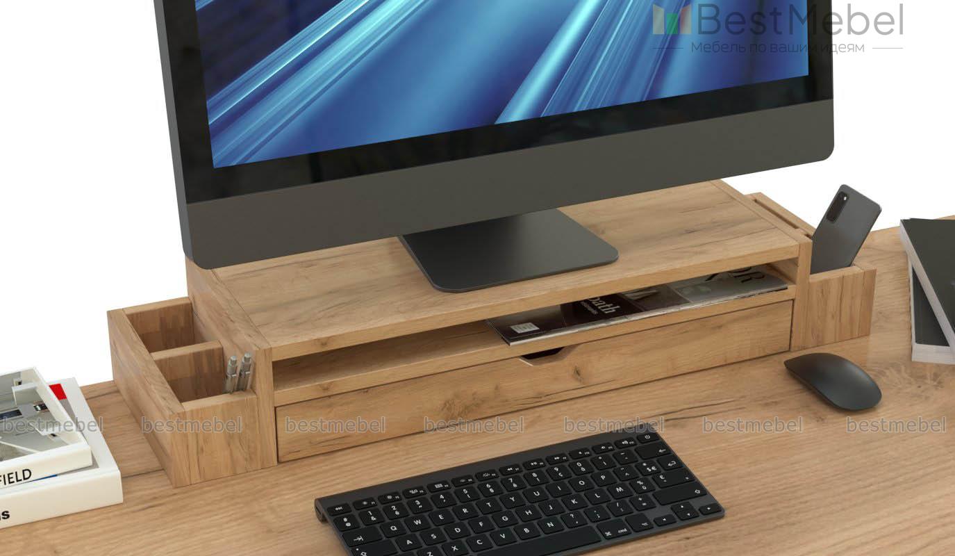 Подставка под монитор Кай-15 BMS оборудована просторной столешницей, выдвижным ящиком, нишей и четырьмя открытыми боковыми отделениями. Практичная конструкция даст вам возможность не только приподнять на удобную высоту монитор, но и хранить под рукой все необходимые канцелярские мелочи, бумаги, телефон и многое другое. Лаконичная ступенчатая подставка станет универсальным выбором для современных компьютерных столов. Купить подставку под монитор Кай-15 BMS приглашаем в наш интернет-магазин.