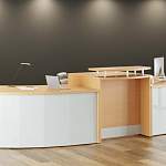 Стойка ресепшн Лайн 9 BMS – это полукруглая радиусная модель, объединившая два рабочих стола для администраторов и центральную секцию для посетителей. Разноуровневая модель, выполненная в сочетании древесных тонов и белого, отличается простым и оригинальным современным дизайном. Практичная конструкция стойки позволяет с комфортом работать с документами и принимать большое количество посетителей. Купить стойку ресепшн Лайн 9 BMS для просторного офиса приглашаем в наш интернет-магазин.