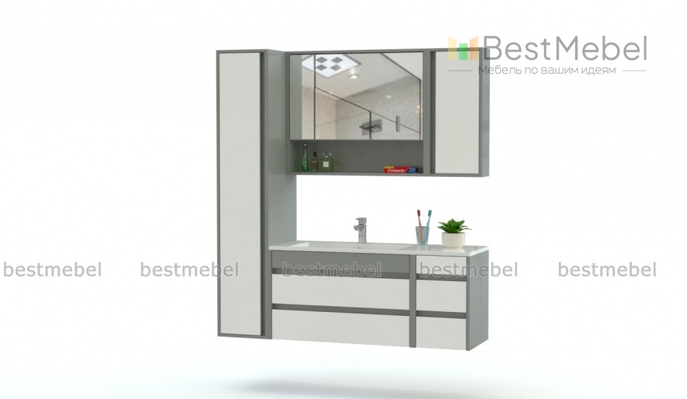 Мебель для ванной Глосс 5 BMS дополнит ультрасовременные интерьеры в стиле минимализм и хай-тек. Подвесная композиция включает в себя широкую тумбу под раковину, узкую тумбу с ящиками для хранения мелочей, зеркало с открытой полкой, распашной шкаф и пенал. Гладкие стеклянные фасады без лицевой фурнитуры просты в уходе и долговечны, в оформлении скомбинированы белый и контрастный серый цвета. Купить мебель для ванной Глосс 5 BMS вы сможете в нашем интернет-магазине с подбором цветового решения по каталогу.