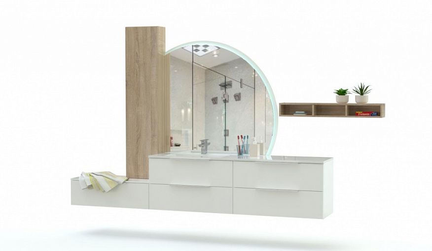 Мебель для ванной комнаты Стэп 1 BMS станет частью элегантного современного интерьера с элементами стиля модерн или ар-деко. Подвесная композиция включает в себя широкую ступенчатую тумбу под раковину с выдвижными ящиками, пенал, асимметричное полукруглое зеркало с подсветкой и открытую полочку для хранения базовых уходовых средств. В оформлении предметов эффектно скомбинированы белый глянец и насыщенные древесные тона. Купить мебель для ванной комнаты Стэп 1 BMS вы сможете в нашем интернет-магазине с подбором фурнитуры и цвета по каталогу.
