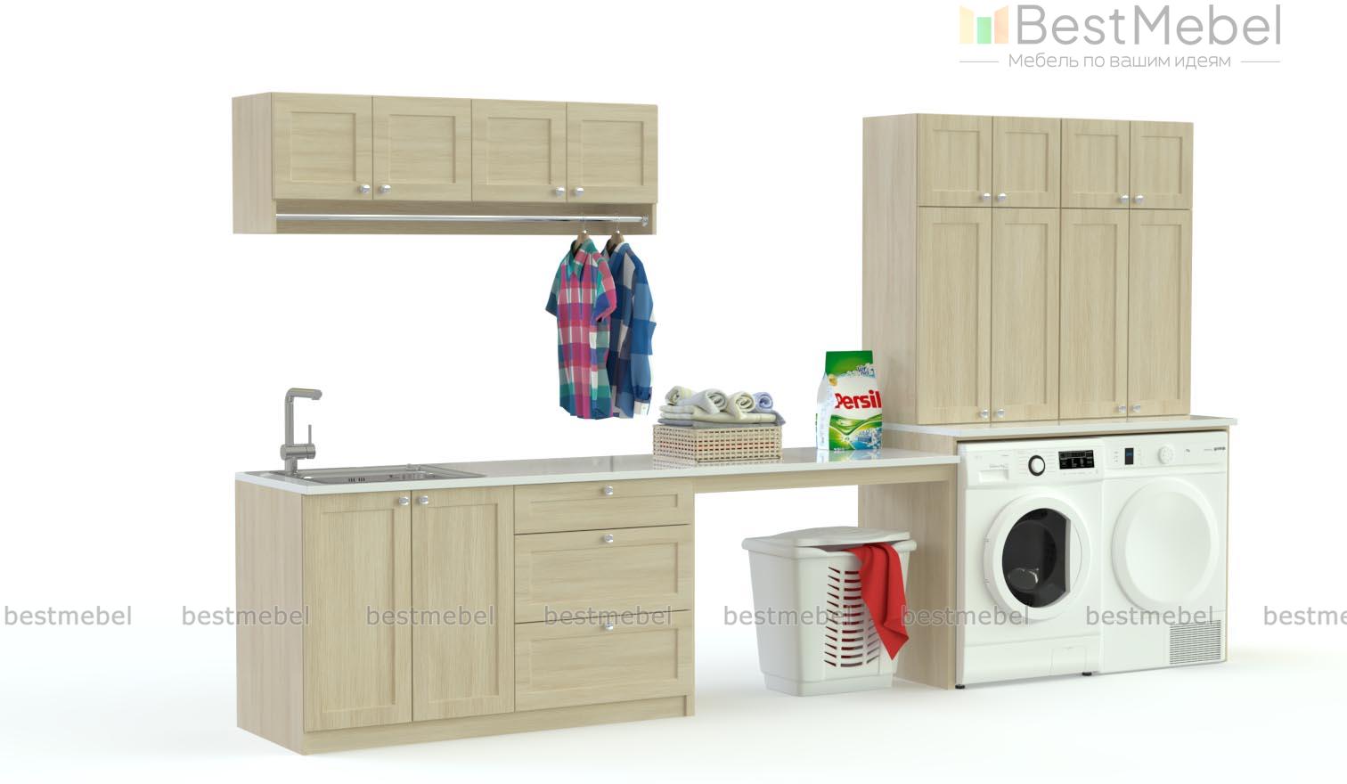 Прачечная Немо 1 BMS предназначена для меблировки просторных помещений в частных домах и оборудована всем необходимым для стирки, сушки и глаженья белья. Композиция в современном классическом стиле станет частью элегантного и комфортного интерьера. В комплект входят секция с мойкой, выдвижными ящиками и просторной столешницей, навесной распашной шкафчик, дополненный штангой, и шкаф с нишей под стиральную и сушильную машины в основании. Купить прачечную Немо 1 BMS приглашаем в наш интернет-магазин с учетом оптимальных параметров.