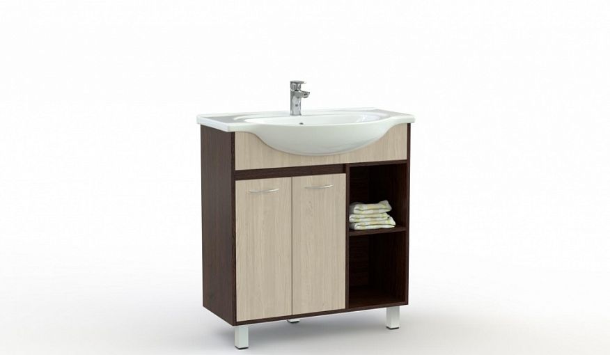 Тумба для ванной Кварта 10 BMS выглядит элегантно с корпусом оттенка венге и светлыми древесными фасадами. Модель на высоких регулируемых опорах поможет установить раковину и скрыть коммуникации, а для хранения средств по уходу и хозяйственных мелочей оборудована двухдверным распашным отделением и открытой секцией с полкой. Средние габариты тумбы подходят для помещений разной планировки. Купить тумбу для ванной Кварта 10 BMS вы сможете недорого в нашем интернет-магазине.