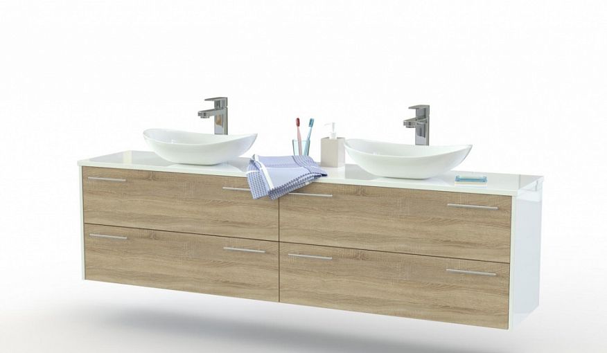 Тумба под раковину Франко 5 BMS станет не только практичным дополнением интерьера большой ванной комнаты, но и элементом дизайна. Широкая тумба с древесным глянцевым фасадом и хромированной фурнитурой предназначена для установки сразу двух раковин-чаш и дополняется разделительным стеллажом. Подвесная конструкция облегчает уборку, а всегда держать под рукой уходовые средства и прочие нужные мелочи помогут четыре глубоких выдвижных ящика. Купить тумбу под раковину Франко 5 BMS приглашаем в наш интернет-магазин.