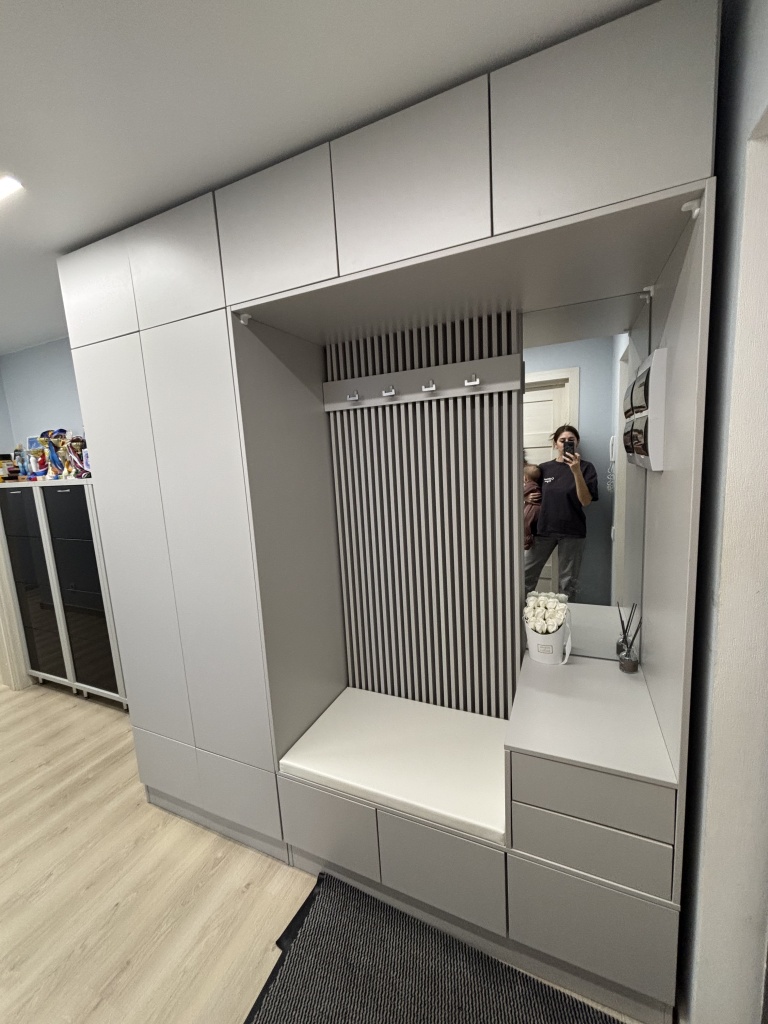 Заказ 00000103349.Взяли прихожую "Дублин 34 BMS" и в целом очень довольны, но сборка – это отдельная история. Главный плюс, который нас покорил – возможность заказать точный размер и цвет. У нас прихожая довольно узкая, и стандартные варианты просто не подходили. Сделали под наши замеры – встала идеально, как будто так и было задумано. Цвет выбрали серый – смотрится очень стильно, современно и правда делает маленькое пространство светлее и визуально просторнее. Функционально – все отлично. Места хранения действительно много: и верхние, и нижние шкафы легко вмещают все куртки, даже толстые зимние. Платяное отделение – спасение для вещей, которые не хочется мять. Очень удобна открытая вешалка с большим зеркалом – можно быстро что-то повесить или посмотреть на себя перед выходом, не бегая в ванную. Ящики внизу здорово организовали всю мелочь – перчатки, шапки, шарфы теперь не теряются. Качество на вид хорошее: фасады ровные, фурнитура пока не подводит (доводчики и шариковые направляющие). Но есть один существенный минус – сборка. Деталей очень много. Когда распаковали все коробки, немного растерялись от количества упаковок и элементов. Инструкция вроде понятная, но сам процесс требует времени, терпения и много свободного места. Собирать в одиночку – крайне сложно и долго.Нам с мужем пришлось потратить почти целый день, работая вдвоем, и это было довольно напряжно. Если вы один или не уверены в своих силах – советую сразу закладывать стоимость сборки мастера или звать очень опытного помощника.Если вы готовы к сборке (или закажете ее) – это отличный вариант для организации порядка в прихожей. Мы довольны результатом, хоть и пришлось попотеть. Выглядит дороже, чем стоит!