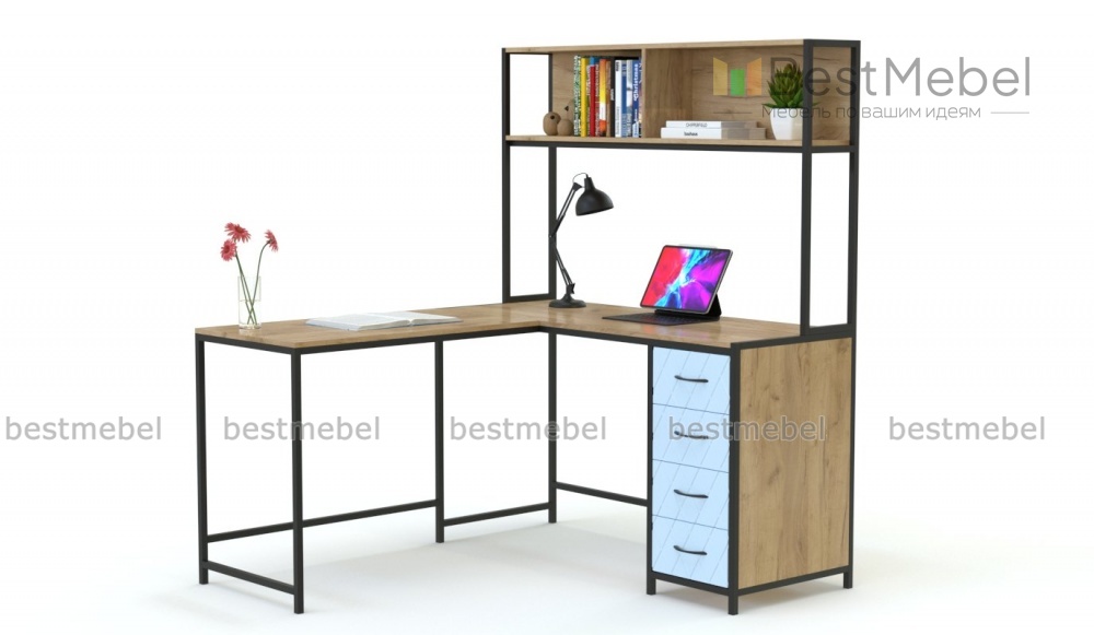Компьютерный стол Флора 14 BMS позволяет выгодно использовать возможности планировки благодаря своей угловой конструкции. Фасады четырех выдвижных ящиков выполнены из МДФ в светлом голубом оттенке, и украшены изящной фрезеровкой в виде полосок. Просторная столешница позволит с комфортом разместить все необходимое для работы и учебы, а надстройка с открытой полкой легко вместит книги или учебную литературу. Купить компьютерный стол Флора 14 BMS по привлекательной цене с подбором фурнитуры приглашаем в наш интернет-магазин.