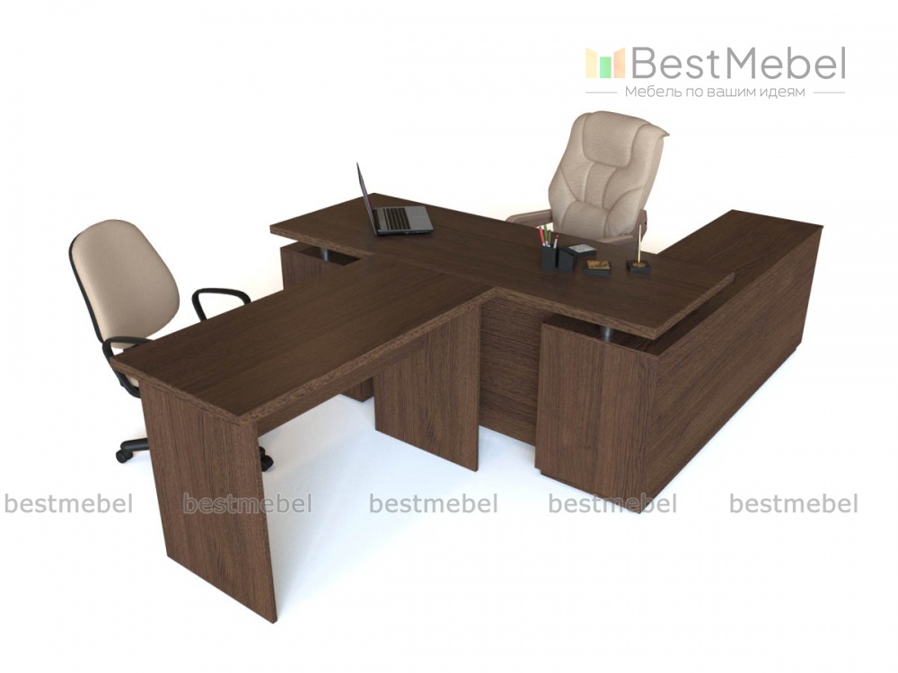 Стол руководителя Ливерпуль 2 BMS – современная модель для просторного кабинета, оборудованная всем необходимым для успешной работы. Письменный стол с двумя опорными тумбами, в которых разместятся под рукой документы, канцелярские мелочи и личные вещи, дополнен удобным для проведения совещаний брифингом. Строгие четкие формы подчеркивает исполнение в темных оттенках под массив дуба.