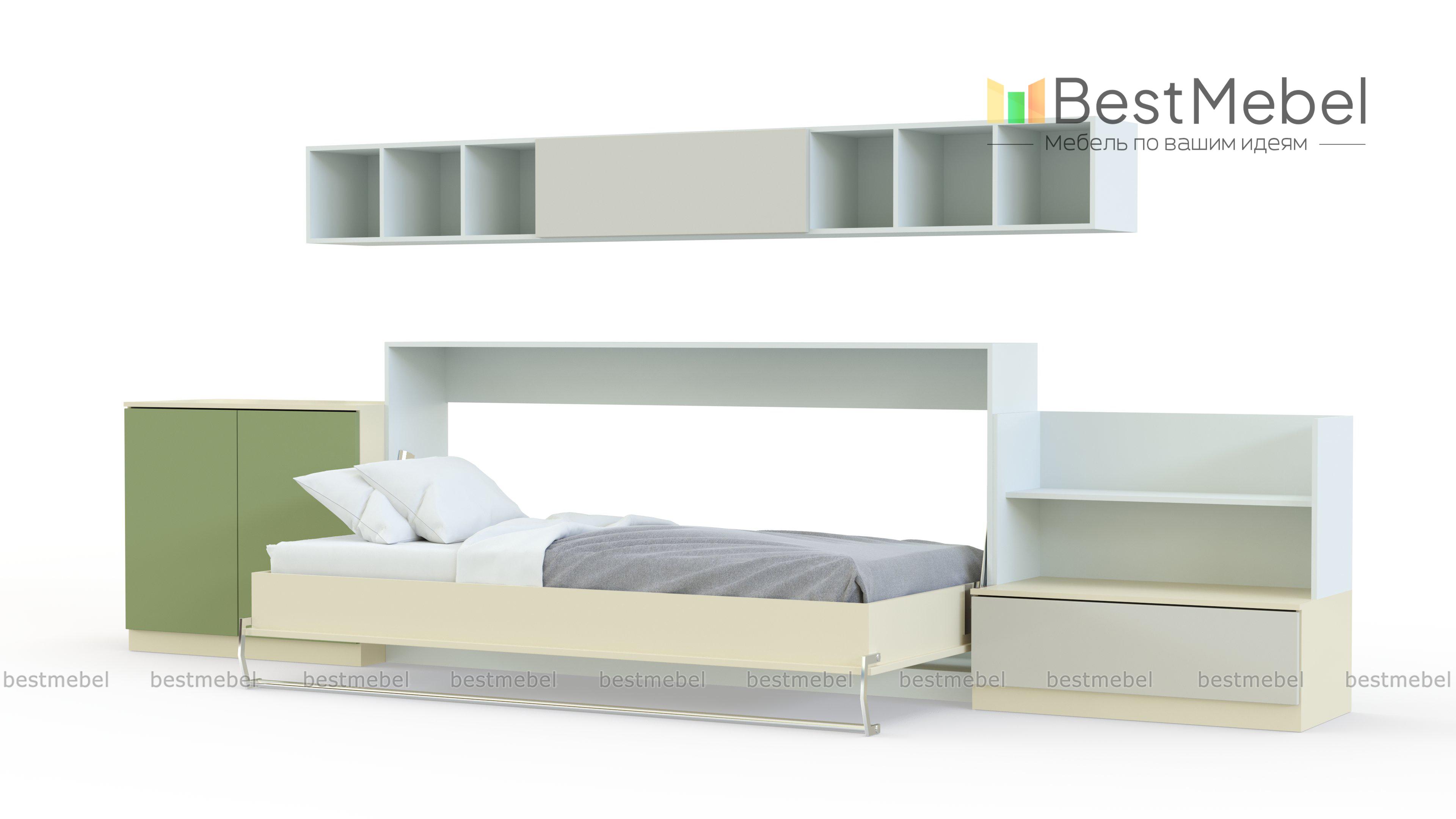 Шкаф-кровать трансформер Элли 9 BMS объединил все самое необходимое современной молодежной комнате. Креативная модель характеризуется актуальным дизайном, отличной эргономикой и позволяет значительно сэкономить полезную площадь. В комплект входят горизонтальный модуль-трансформер с откидной кроватью и столешницей, стеллаж, тумба и навесные книжные полки, выполненный в сочетании нейтральных тонов с яркими цветовыми акцентами. Купить шкаф-кровать трансформер Элли 9 BMS приглашаем в наш интернет-магазин по лучшей цене.