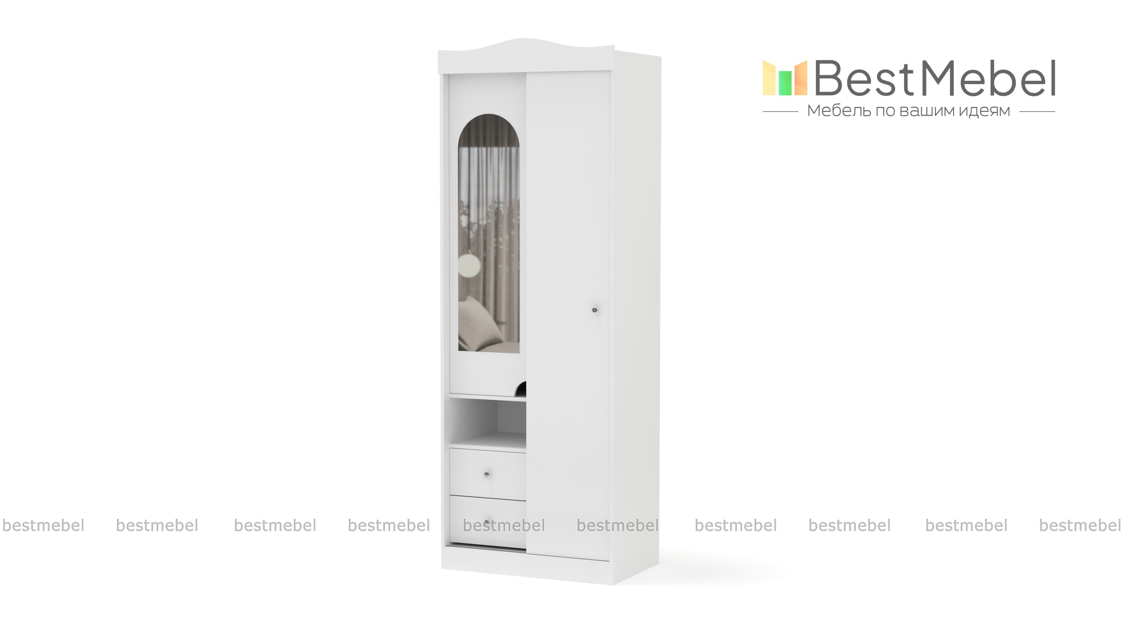 Отличная небольшая модель современного шкафа-купе Сан-Фернандо 7 BMS отличается оригинальным оформлением и красивым внешним дизайном. Он имеет отдел для верхней одежды с полкой для головных уборов. Кроме этого за зеркальной дверкой расположены вместительные полочки, а выдвижные нижние тумбочки дадут возможность разместить множество мелких вещей. Украшают шкаф оригинальные круглые ручки и красивое оформление верхней части. Купить такую мебель можно для спальни или прихожей.