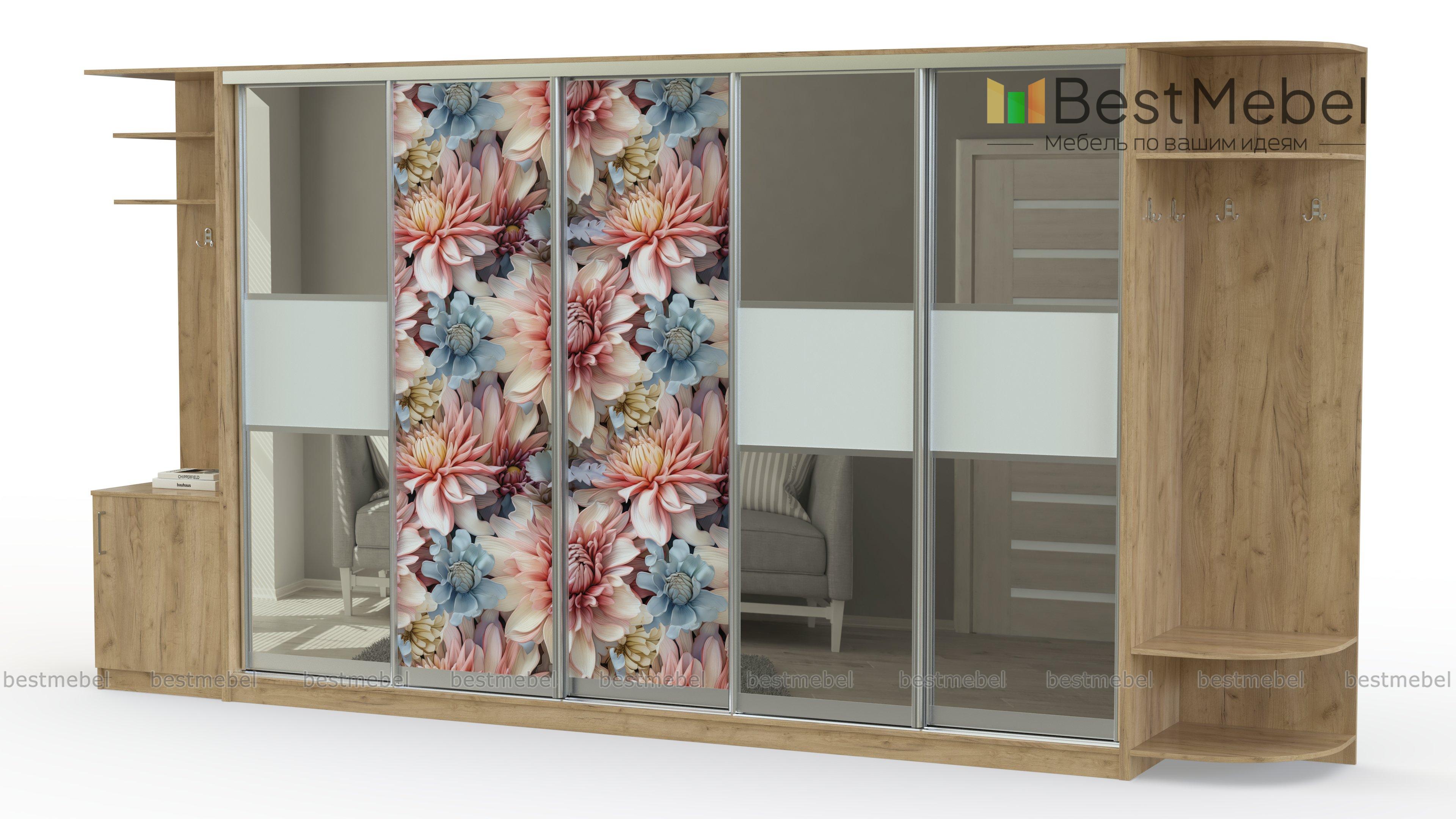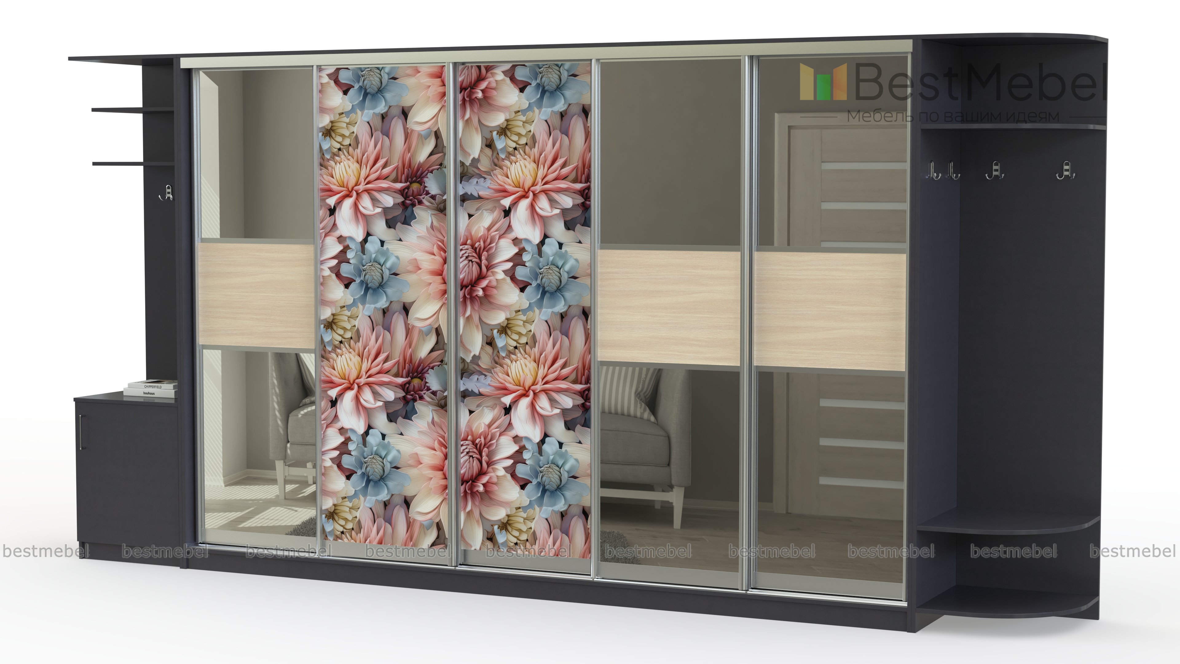 Шкаф-купе Аура 1 BMS – удобная система хранения для просторной прихожей, которая поможет разместить большое количество вещей и разгрузить другие помещения дома от лишней мебели. Пятидверный шкаф оборудован раздвижными отделениями с платяными и бельевой секциями, а также торцевыми открытыми вешалками – с радиусными полками и с распашной тумбой. Фасад шкафа декорирован зеркалами и цветочной фотопечатью. Купить шкаф-купе Аура 1 BMS с учетом необходимых параметров приглашаем в наш интернет-магазин.