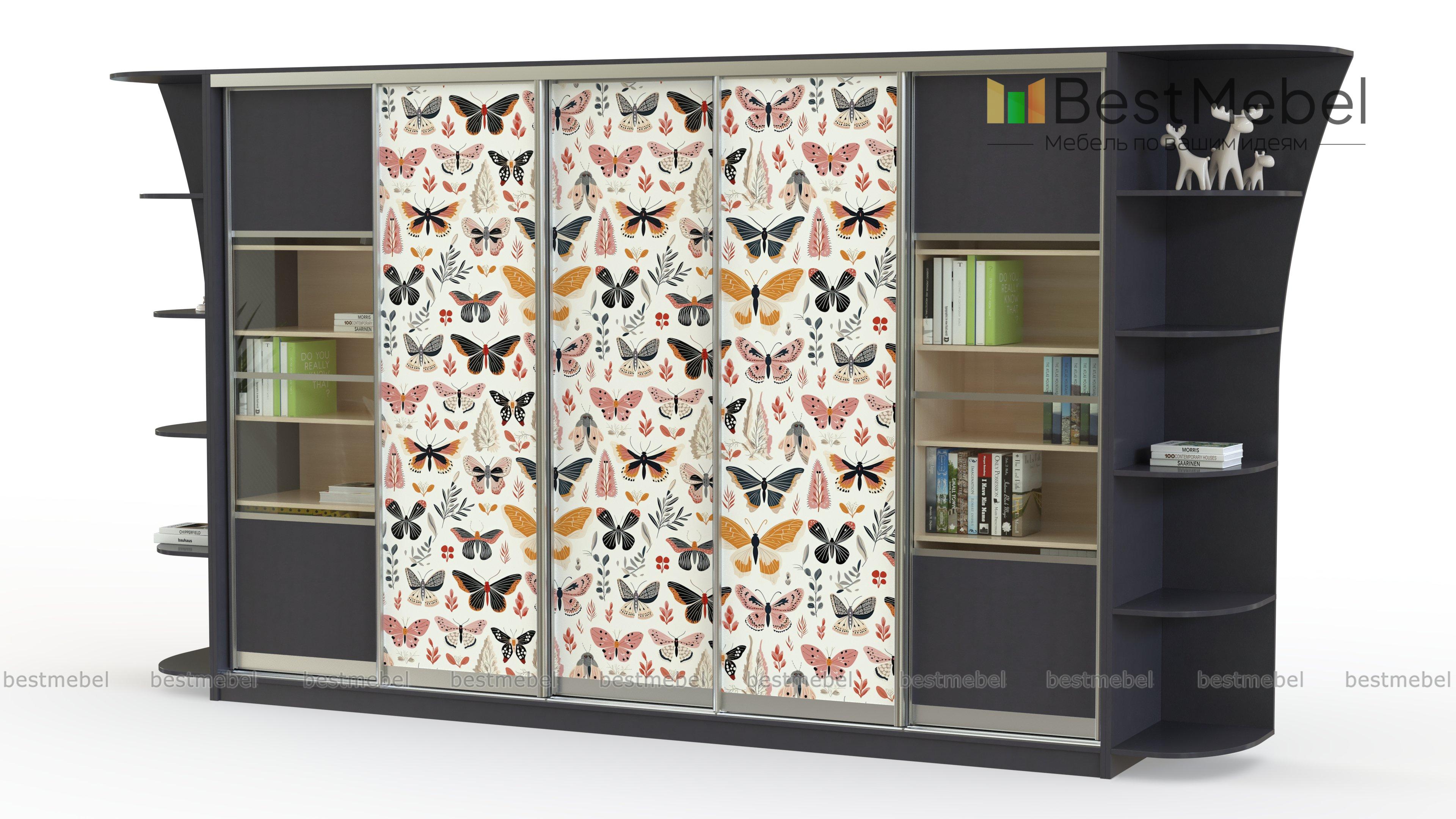 Шкаф-купе Каролина 12 BMS сочетает в себе удобный функционал и современную эстетику. Основное отделение с тремя глухими и двумя застекленными дверцами дополнено фигурно вырезанными торцевыми стеллажами. Разноплановые секции обеспечат удобное хранение одежде и домашнему текстилю, книгам и бытовым мелочам, а украсит интерьер гостиной трендовый принт в спокойной природной гамме. Купить шкаф-купе Каролина 12 BMS с выбором любых размеров, наполнения и цвета вы сможете на сайте нашего интернет-магазина.