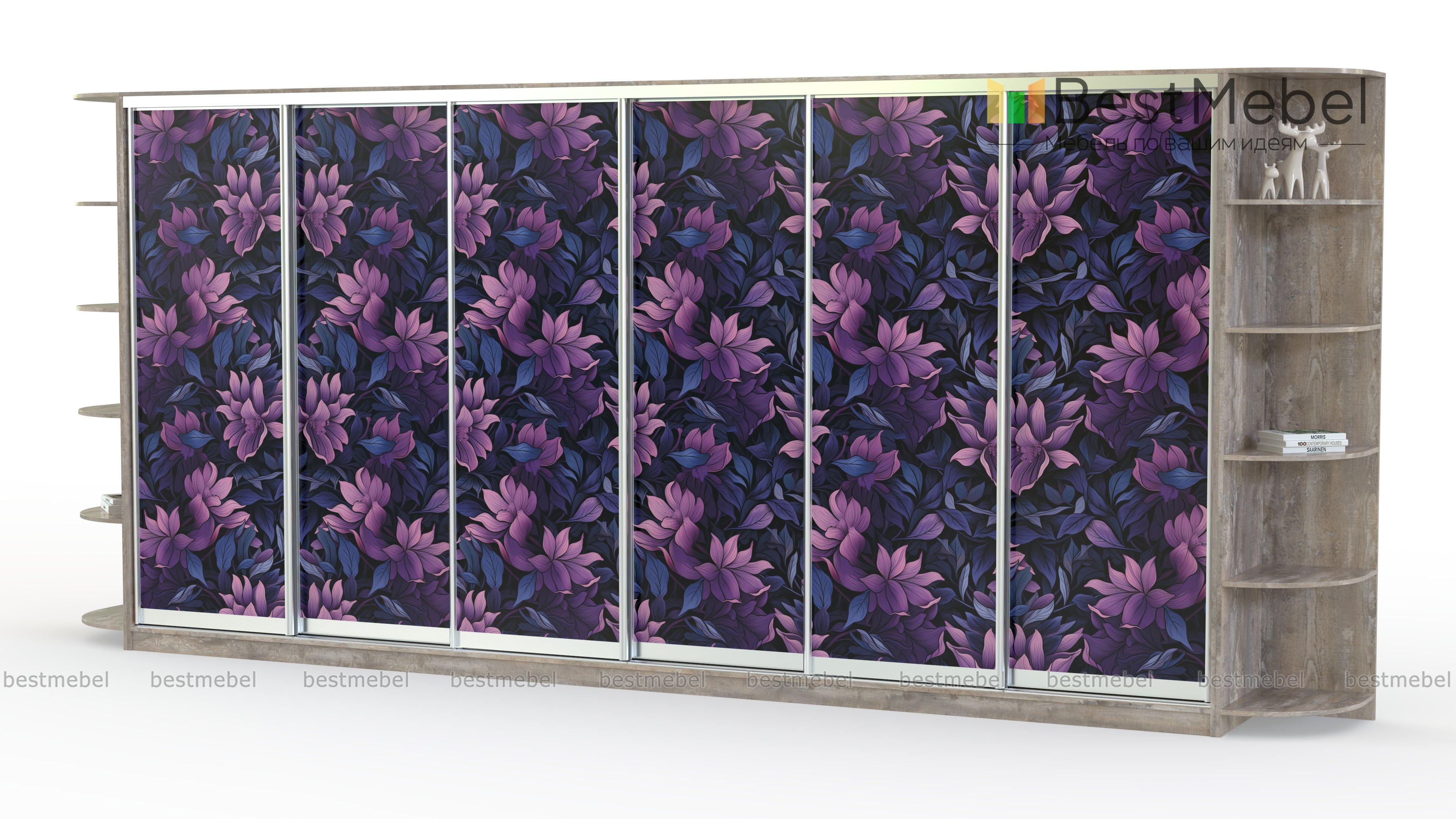 Шкаф-купе Пальмы BMS с цветочным узором в насыщенных лиловых оттенках эффектно дополнит просторные помещения. Шестидверная модель легко решает проблему хранения семейного гардероба и домашнего текстиля, помогая освободить пространство от лишней мебели. Завершенный вид шкафу придают симметрично расположенные и скругленные для безопасности книжные стеллажи. Купить шкаф-купе Пальмы BMS, изготовленный по вашим размерам, приглашаем в наш интернет-магазин.