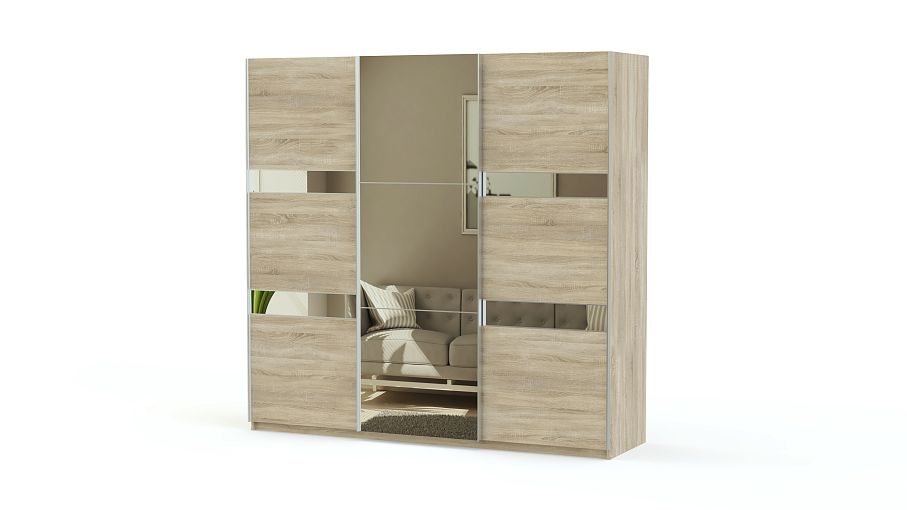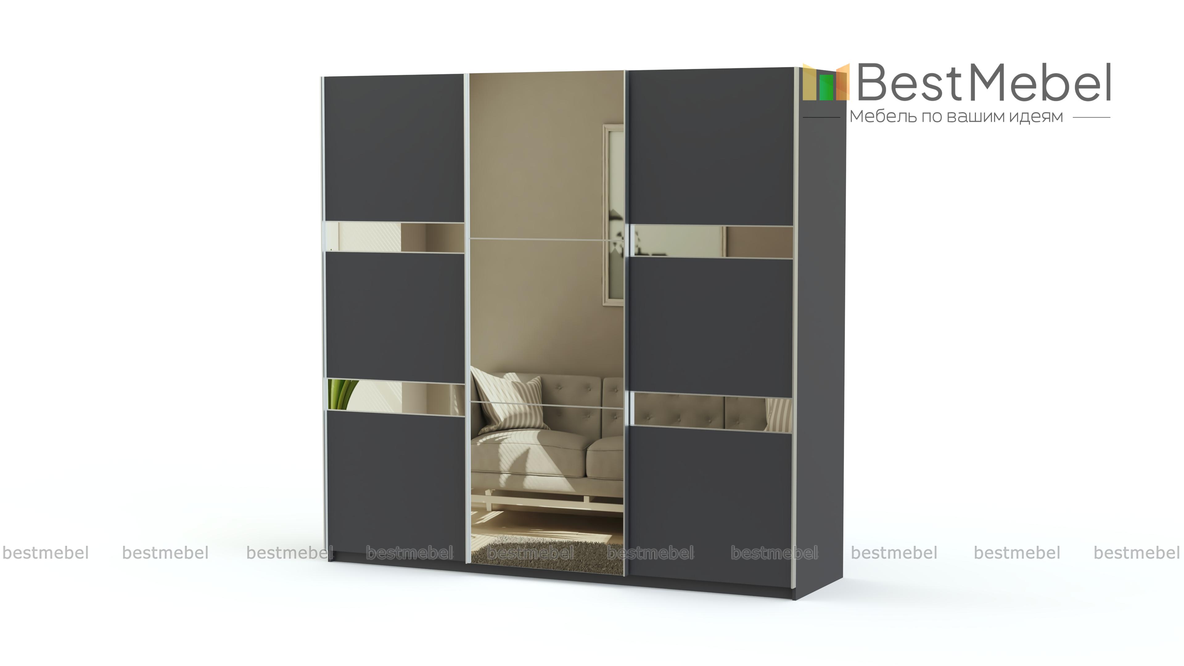 Современный шкаф-купе с оригинальным дизайном. Трехдверный фасад с горизонтальным делением выделен контрастными цветами и зеркалами. Такой шкаф будет одинаково хорошо смотреться в гостиной и прихожей. Конструкция предусматривает наличие вместительных полок, отделений со штангами и 4 выдвижных ящиков для хранения мелких вещей. Здесь найдется место для верхней одежды, платьев и сорочек, постельного белья, дорожных сумок, коробов, зонтов и многого другого, что часто загромождает углы квартиры.
