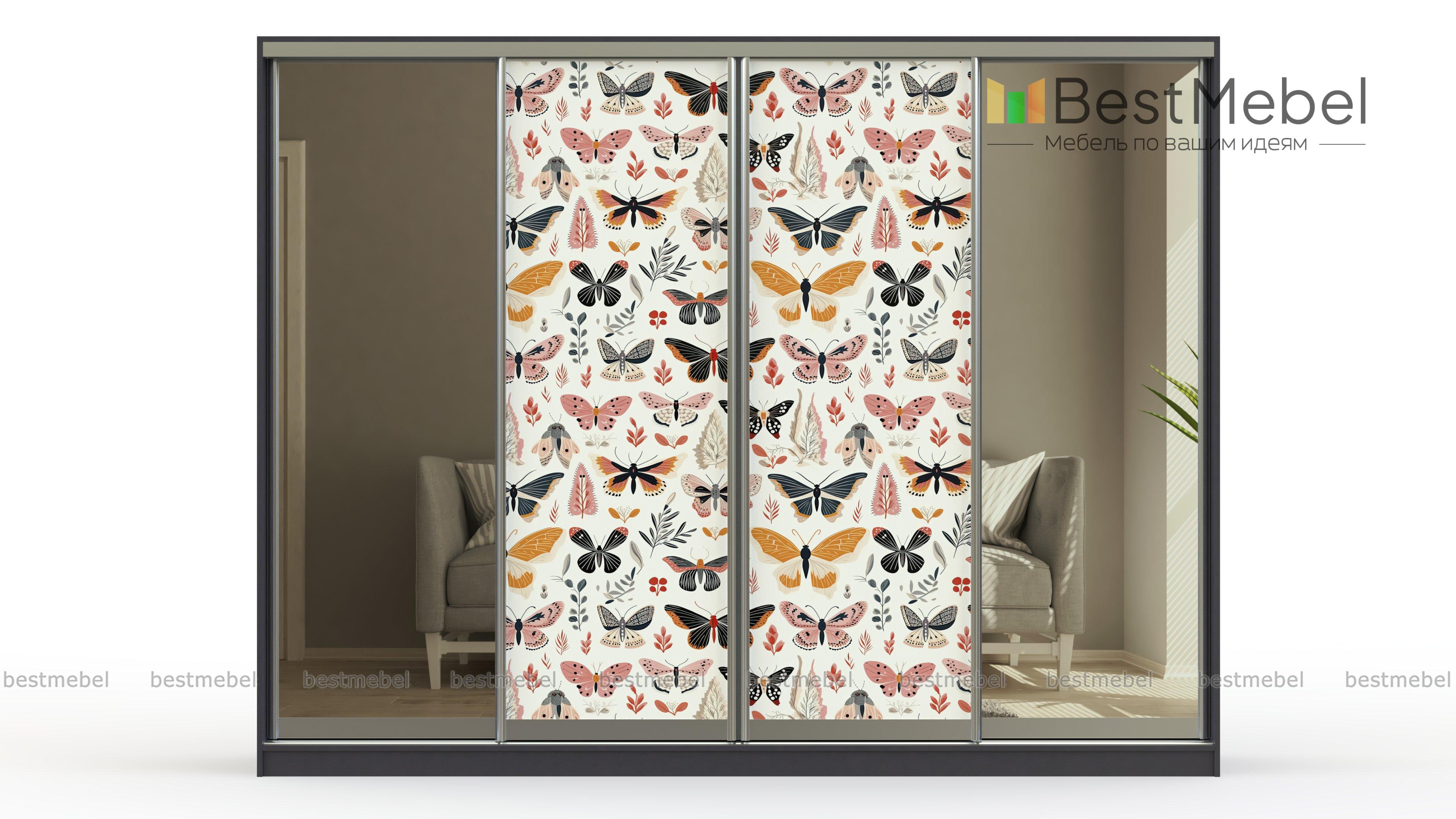 Шкаф-купе Природа 8 BMS гармонично впишется в любое помещение дома: спальню, детскую комнату или прихожую. Центральные створки четырехдверной модели украшает модный принт «бабочки», а боковые представляют собой зеркальные полотна. Визуально легкая и вместительная конструкция выполнена из качественной ламинированной плиты и оснащена надежной системой направляющих. Купить шкаф-купе Природа 8 BMS вы сможете в нашем интернет-магазине, по желанию изменив цвет и размеры.