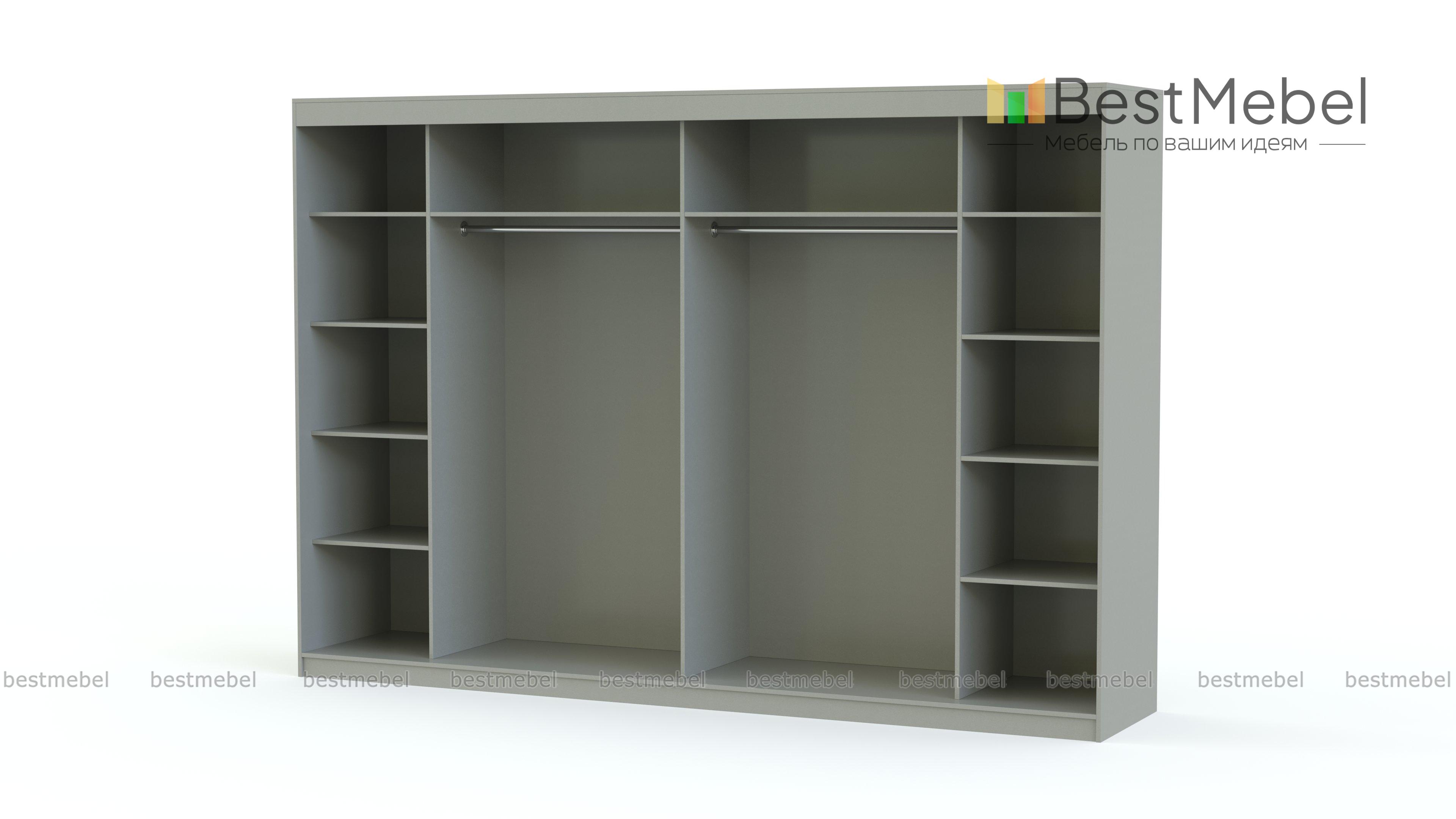 Шкаф-купе Торонто 34 BMS легко вмещает весь семейный гардероб - от мелочей до объемной верхней одежды. Два центральных отделения со штангами и две боковые секции, укомплектованные полками, закрыты шестью раздвижными дверцами. Благодаря минималистичному дизайну шкаф станет базовым решением для вашей спальни или прихожей, сочетаясь с разными по стилю интерьерами. Купить шкаф-купе Торонто 34 BMS вы сможете в нашем интернет-магазине с изготовлением по индивидуальным размерам.