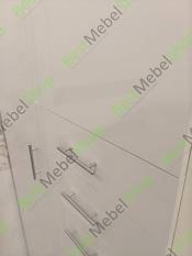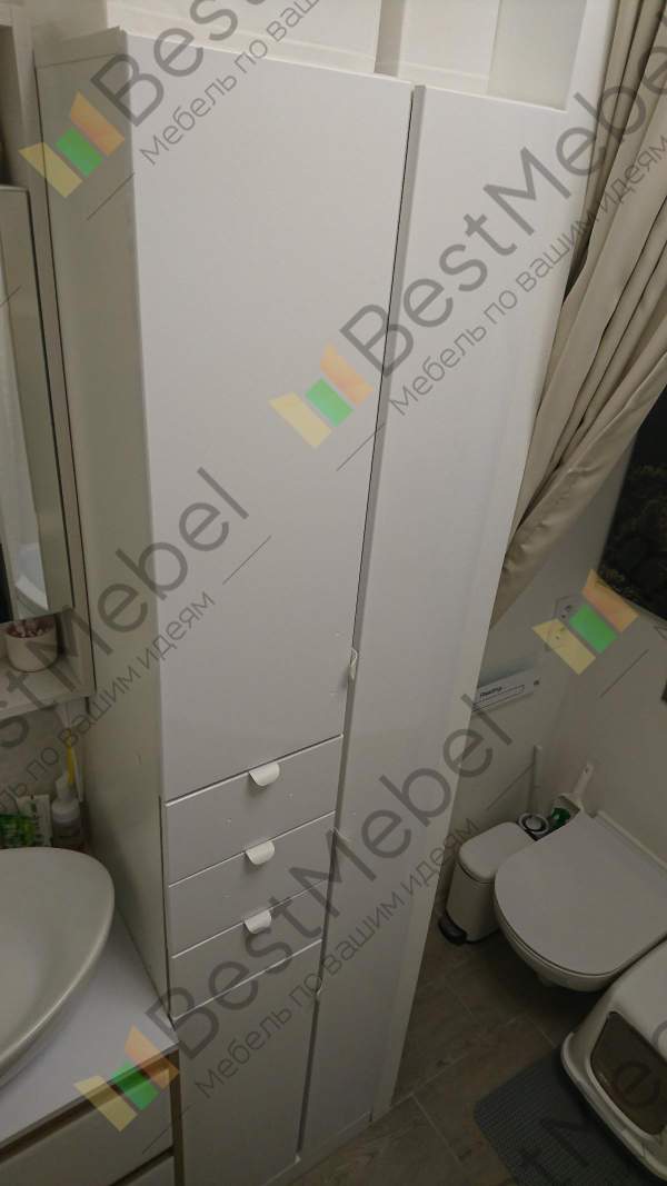 Этот шкаф идеально подошёл на своё место благодаря настройке размеров изделия. Точность изготовления позволила выдержать минимальные зазоры между стеной и раковиной. Вот уж действительно встал как влитой!Стандартные, самые недорогие ручки после примерки решено было заменить на более компактные "лепестки", чтобы меньше цепляться одеждой и взглядом (потому они и белые). Фурнитура очень качественная и солидная (при формировании заказа есть из чего выбрать, заказ 00000423546).