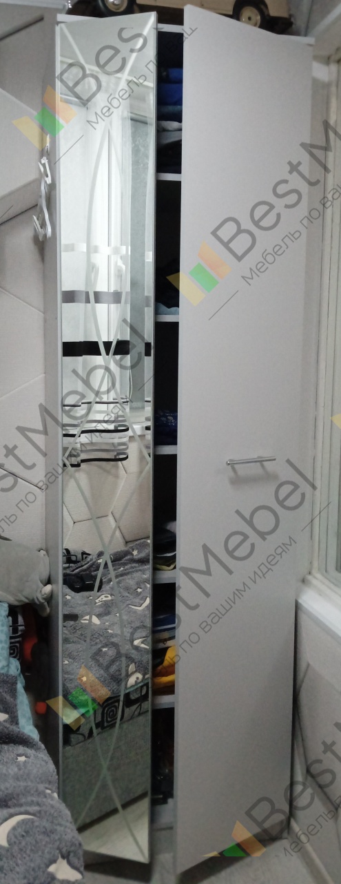 Заказ №00000455318 Пенал Ольбия универсальный BMS (630х2100х442) покупала данный шкаф сыну в комнату, очень довольна качеством, зеркало смотрится очень красиво. Понравилось что можно самой выбирать размер, цвет, фоурнитуру это очень удобно, когда место в помещении ограничено.
