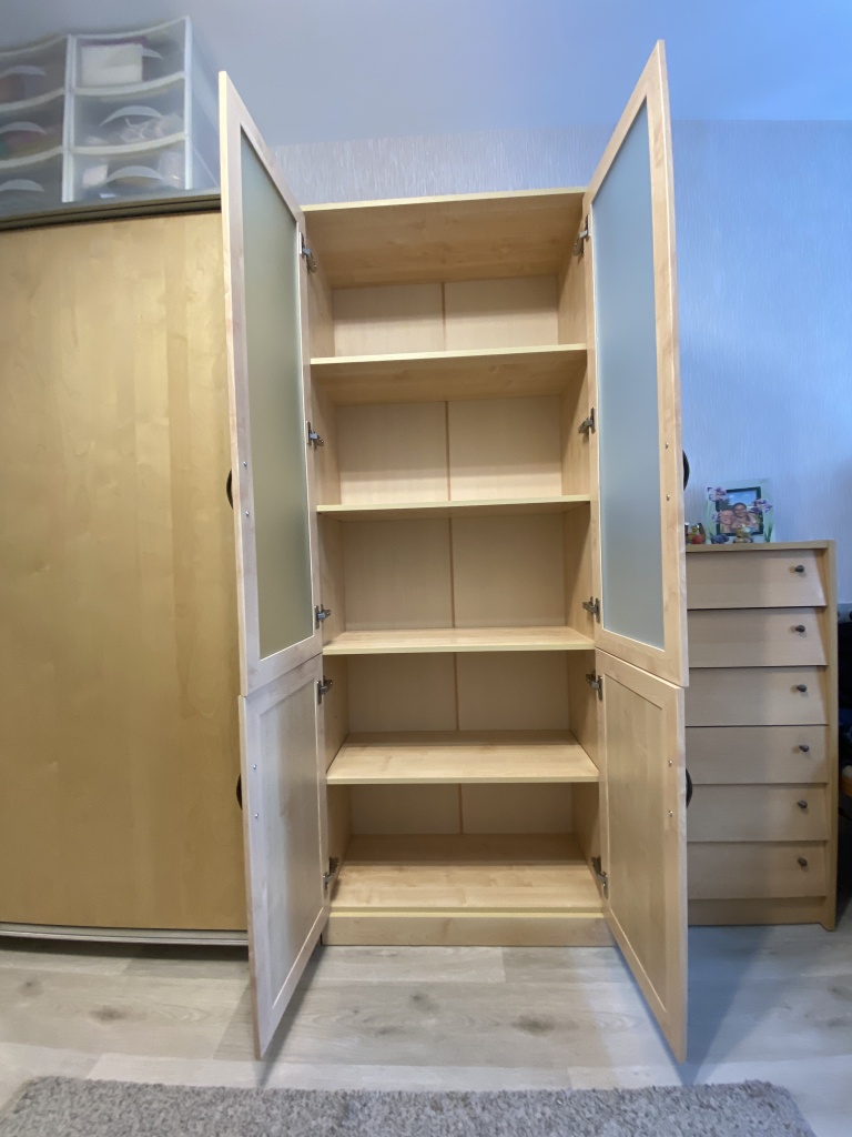 Шкаф мечты наконец-то и у меня. Отличный просто, никаких недочётов Выбирала с доводчиками и бронз.стеклом. Цвет дуб сонома.Привезли быстро, собирается легко и надёжно.Идеальный.Внизу можно хранить ящик с инструментами и швейную машинку.На фото петли ещё не регулированы, но сейчас всё ок, без щелей