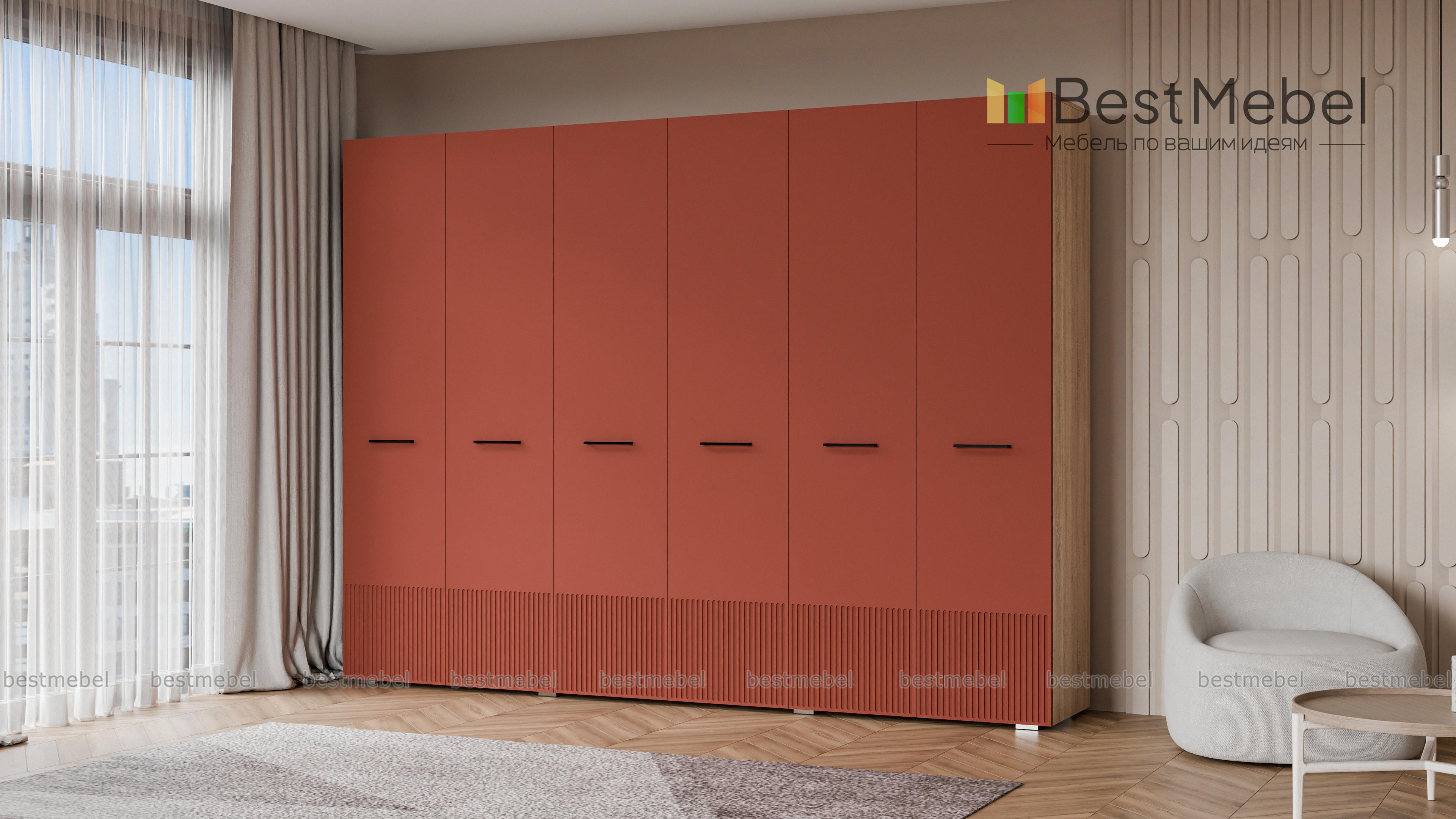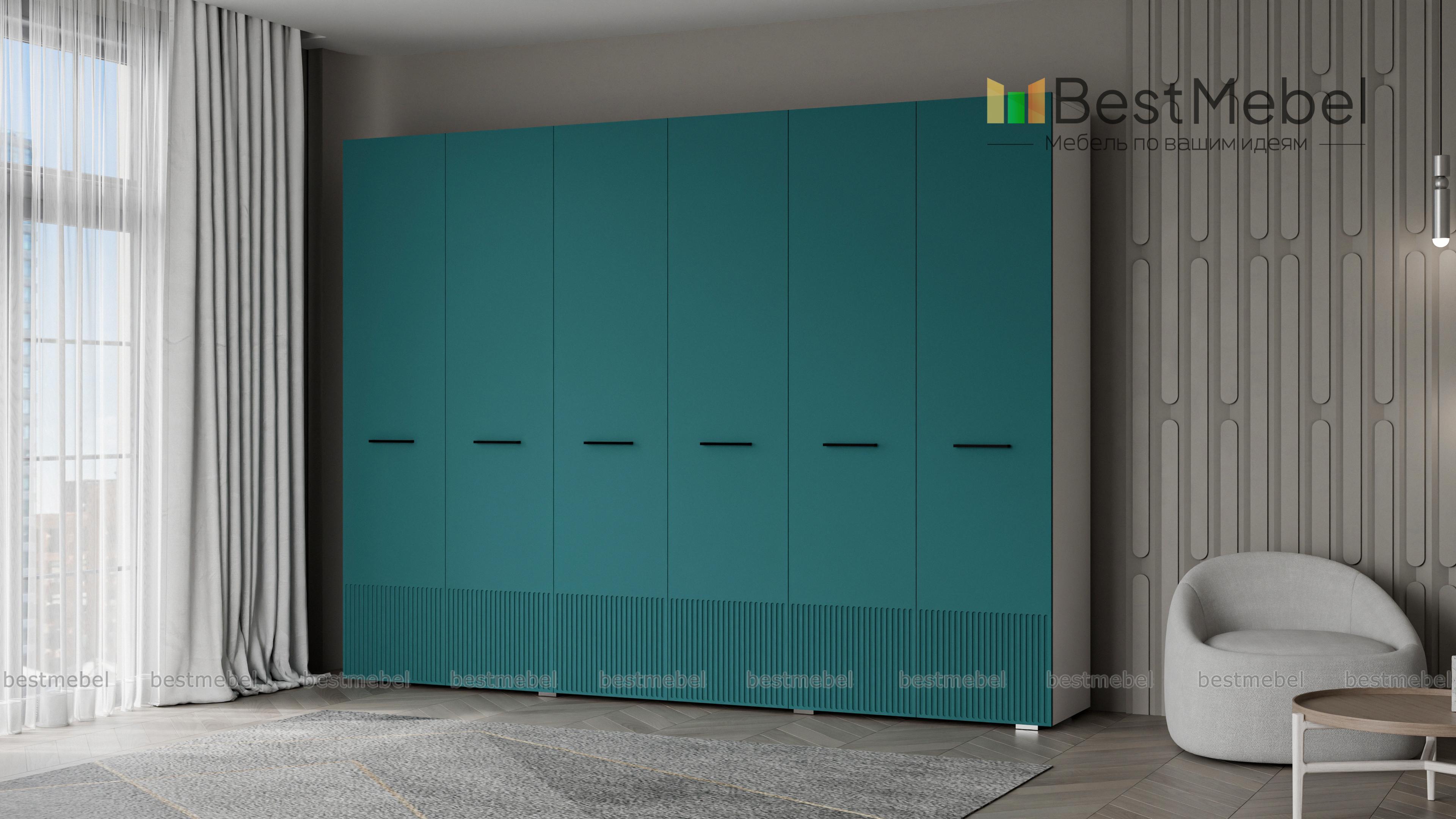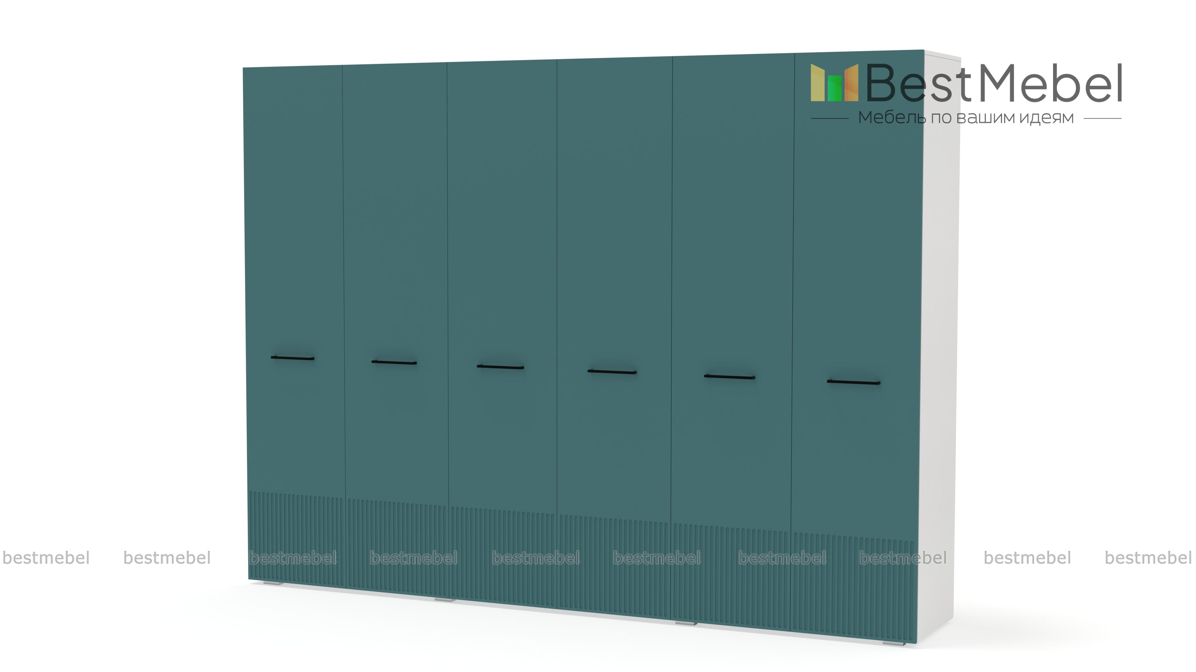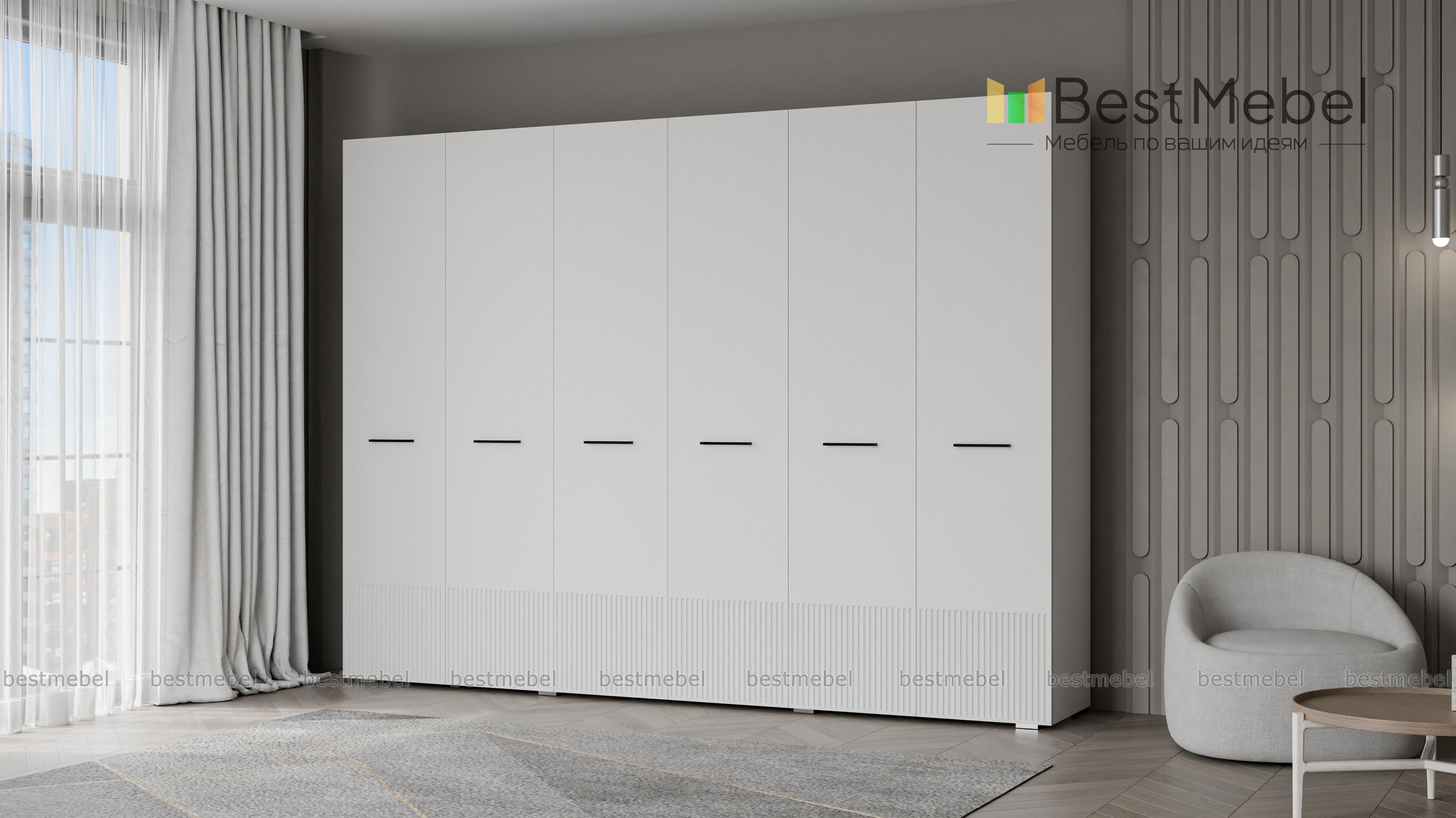 Шкаф распашной Декарт 6 BMS с шестью дверцами создан для хранения в просторных комнатах и обладает отличной вместительностью. Габариты шкафа скрадывает светлый оттенок, фрезеровка в нижней части фасада — практичное и стильное решение. Порядок в вашем гардеробе помогут легко поддерживать две центральные штанги и вместительные бельевые полки по бокам. Купить шкаф распашной Декарт 6 BMS, изготовленный по вашим размерам, приглашаем на сайт нашего интернет-магазина.