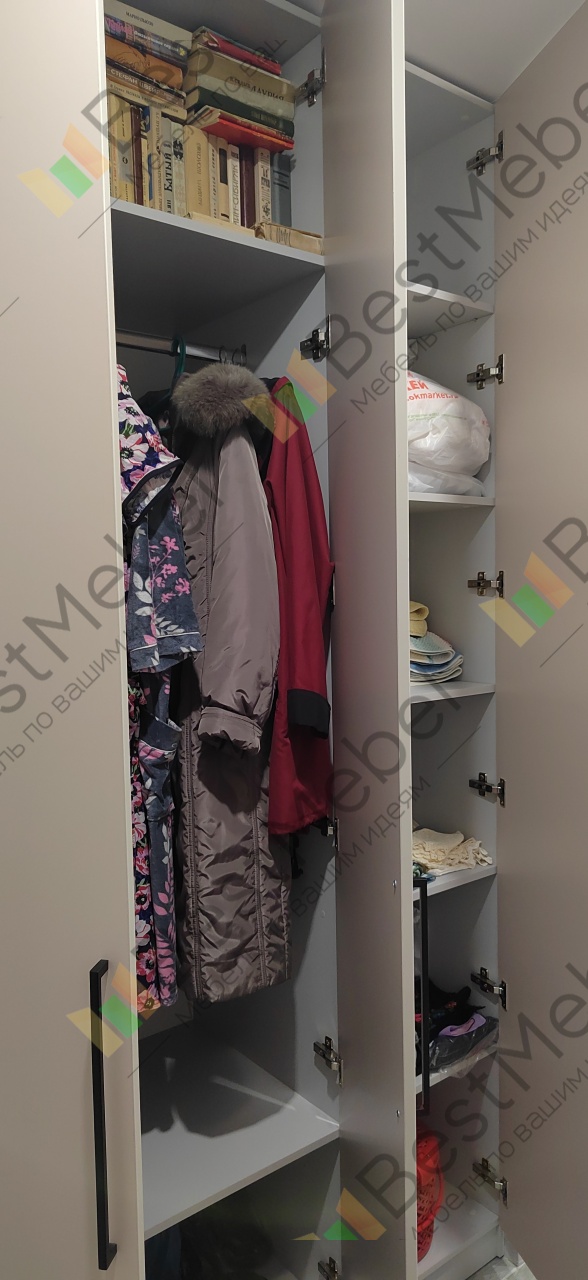 Шкаф распашной Остин Лайт 3 BMS (1860х2490х550), заказ 00000204766. Делали ремонт в коридоре и необходимо было заменить два шкафа, прихожую и дверцы на антресолях. Всё заказали здесь. Увидели на сайте этот шкаф и поняли - это то, что искали. Самостоятельно поменяли размеры, цвет фасадов (Тэффи L) и цвет самого шкафа (серый), кромку лицевых частей на 2 мм. ручки оставили эти (понравились), петли поменяли на Блюмовские с доводчиками. Внутри не меняли, был как надо. Середина - штанга и две полки (сверху и снизу), по бокам полки. Получился очень большой и вместительный шкаф. После оформления заказа на сайте, перезвонила менеджер (минут через 20), еще раз всё уточнила и перепроверила, помогла с точными размерами, чтобы шкаф точно встал в нишу. Всё изготовили быстро. Позвонили и согласовали день доставки. Доставка хорошая, оформляли с поднятием в квартиру. Комплектация полная, всё целое. Выдали документы с гарантией и телефоном компании по сборке. Позвонили туда и через час с нами связался сборщик, согласовали уже с ним дату и время. Отличный парень по сборке мебели. Собрал нам сразу два шкафа и прихожую за 4 часа. Спасибо, что появился такой интернет-магазин! Цена шкафа намного ниже, чем заказывать в компаниях по изготовлению мебели на заказ (узнавали в 5 компаниях) и сроки изготовления в несколько раз быстрее. Спасибо, что появился такой интернет-магазин!