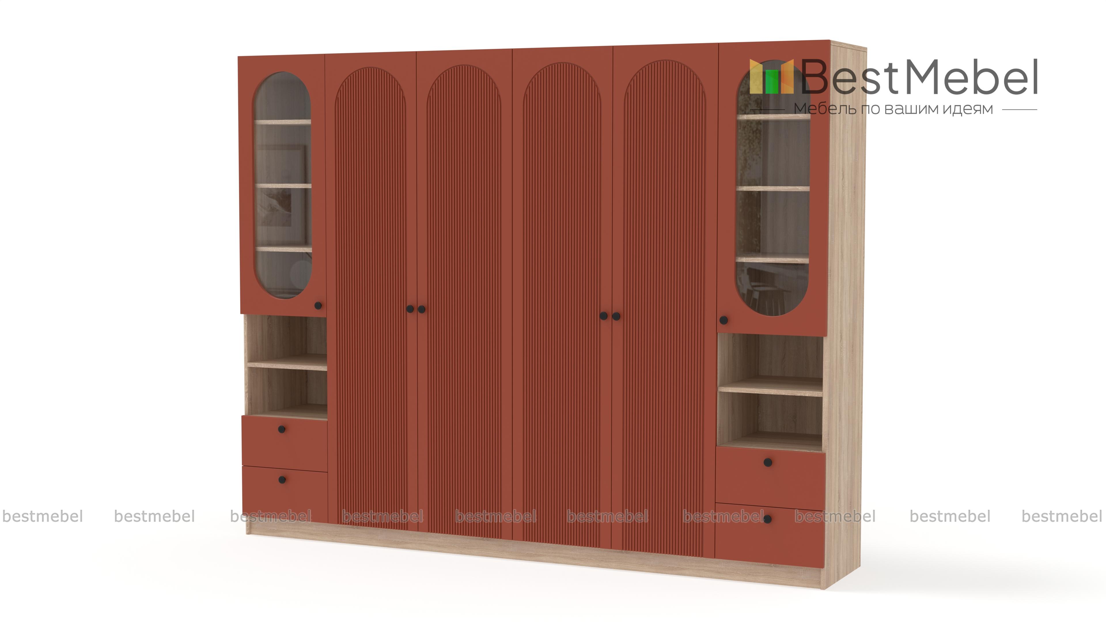 Шкаф распашной Рене 16 BMS представляет собой комбинацию двух платяных отделений в центре и двух витрин. Габаритная конструкция не выглядит громоздко благодаря светлому оттенку корпуса и фасадов, изящной фрезеровке арками и овальным вырезам. Разноплановые отделения позволяют разместить как одежду, так и книги, бокалы, всевозможные мелочи и интерьерные аксессуары. Купить шкаф распашной Рене 16 BMS вы сможете в нашем интернет-магазине с изготовлением по индивидуальным размерам.
