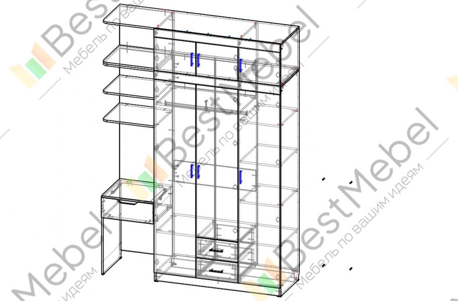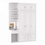 Шкаф со столом Лея 2 BMS поможет вам разместить одежду, сезонные вещи, бытовые мелочи и все необходимое для ухода за собой. Многофункциональная модель объединила трехдверный платяной шкаф с выдвижными ящиками и антресолью, туалетный столик с откидной столешницей, банкетку и просторные открытые полки. Выполненный в белом цвете и декорированный рамочной фрезеровкой, шкаф делает комнату визуально светлее и просторнее. Купить шкаф со столом Лея 2 BMS приглашаем в наш интернет-магазин.